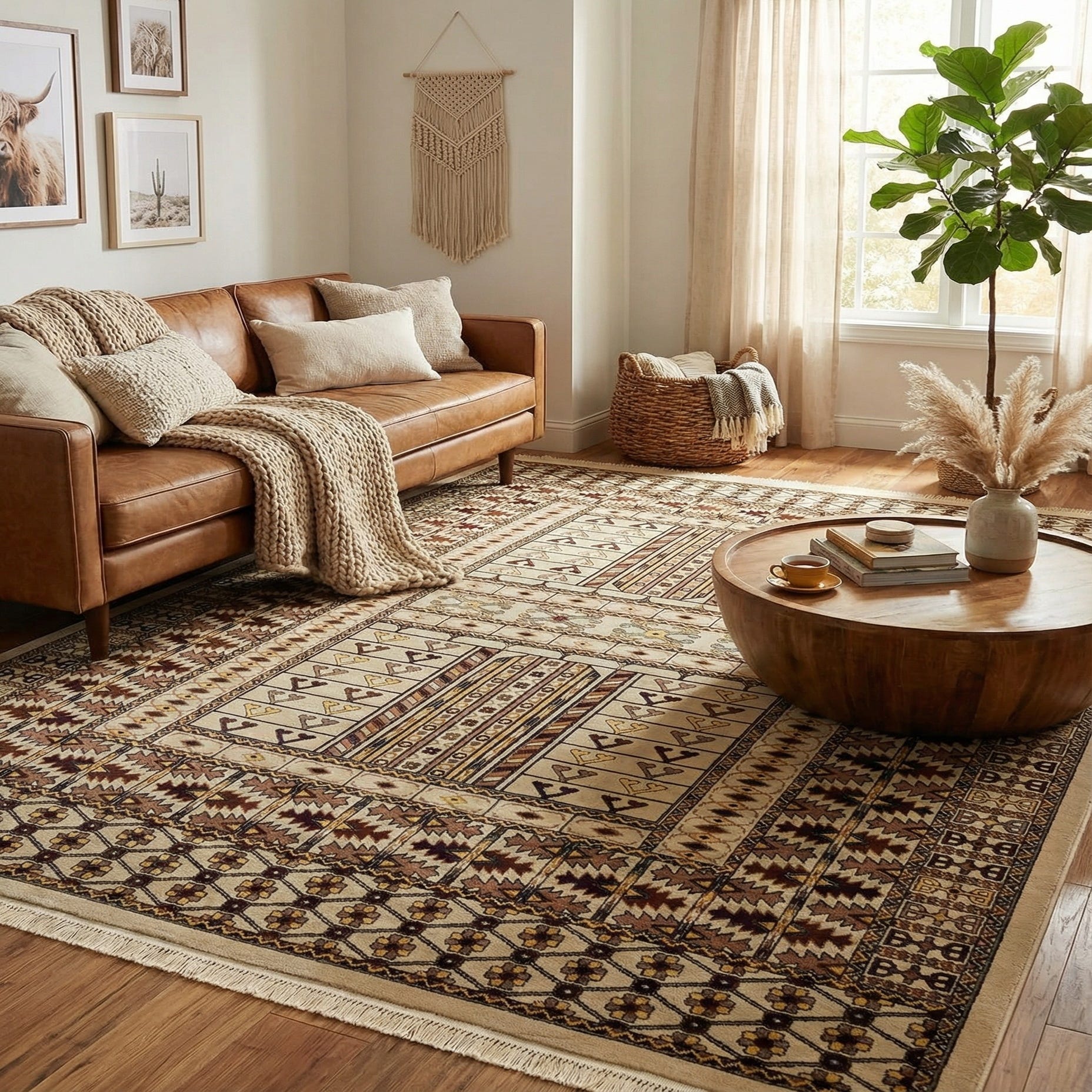 Primary color is Beige. Colors in this rug include: Beige, Black, Brown, Red, Yellow.