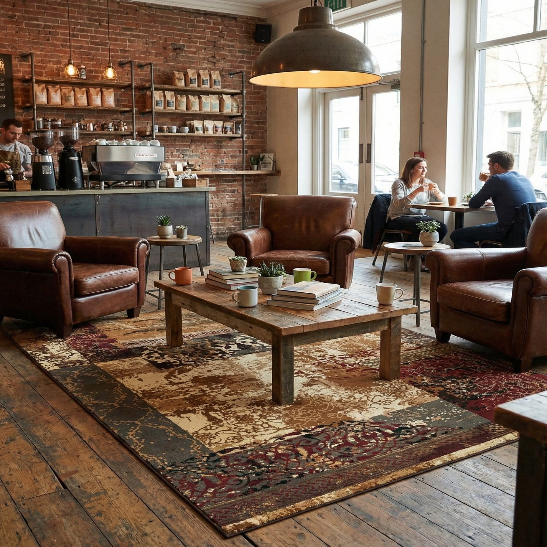 Primary color is Beige. Colors in this rug include: Beige, Black, Blue, Brown, Burgundy, Gray, Olive.