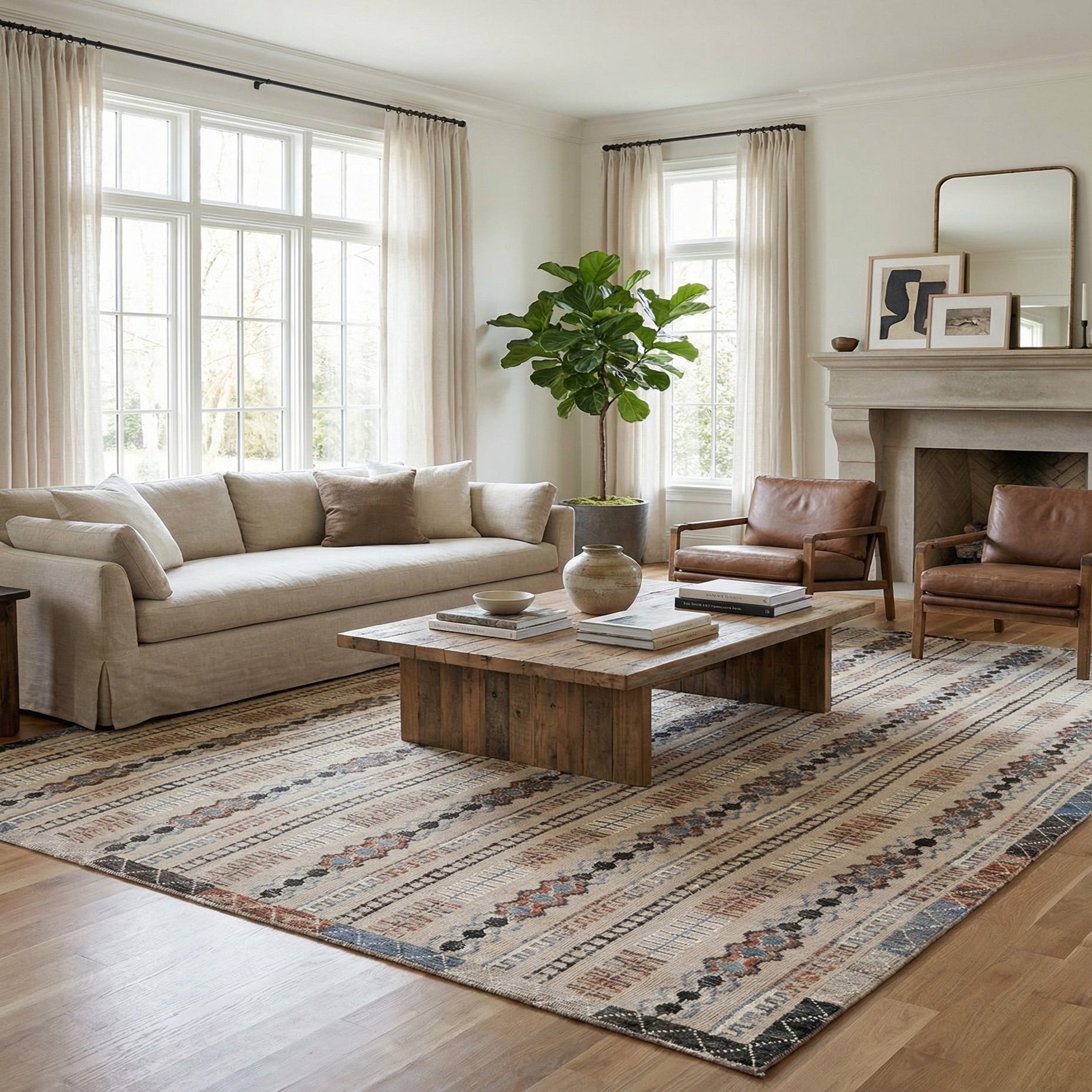 Primary color is Beige. Colors in this rug include: Beige, Black, Blue, Gray, Rust Red, Tan, Terracotta, Ivory.