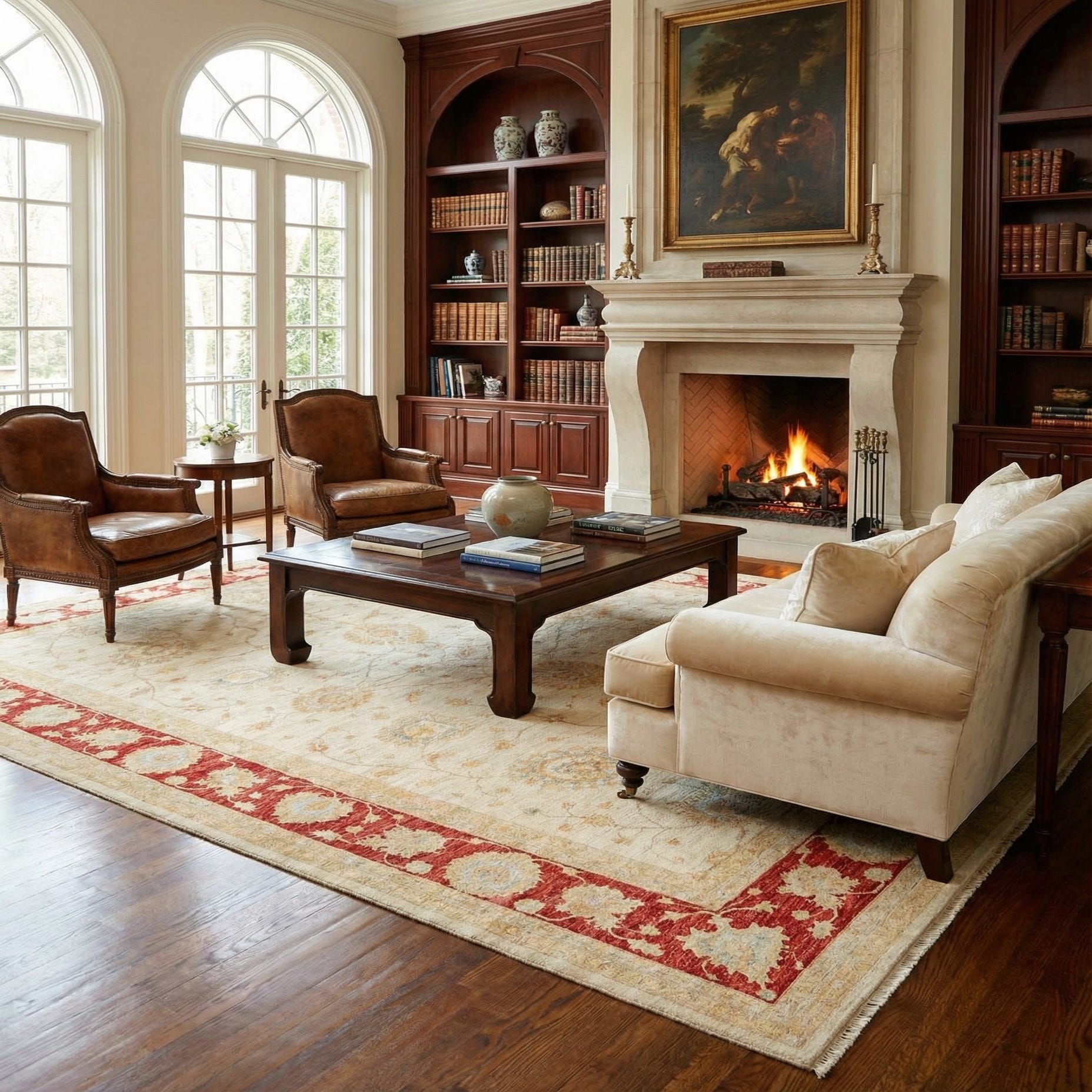 Primary color is Beige. Colors in this rug include: Beige, Beige, Red.