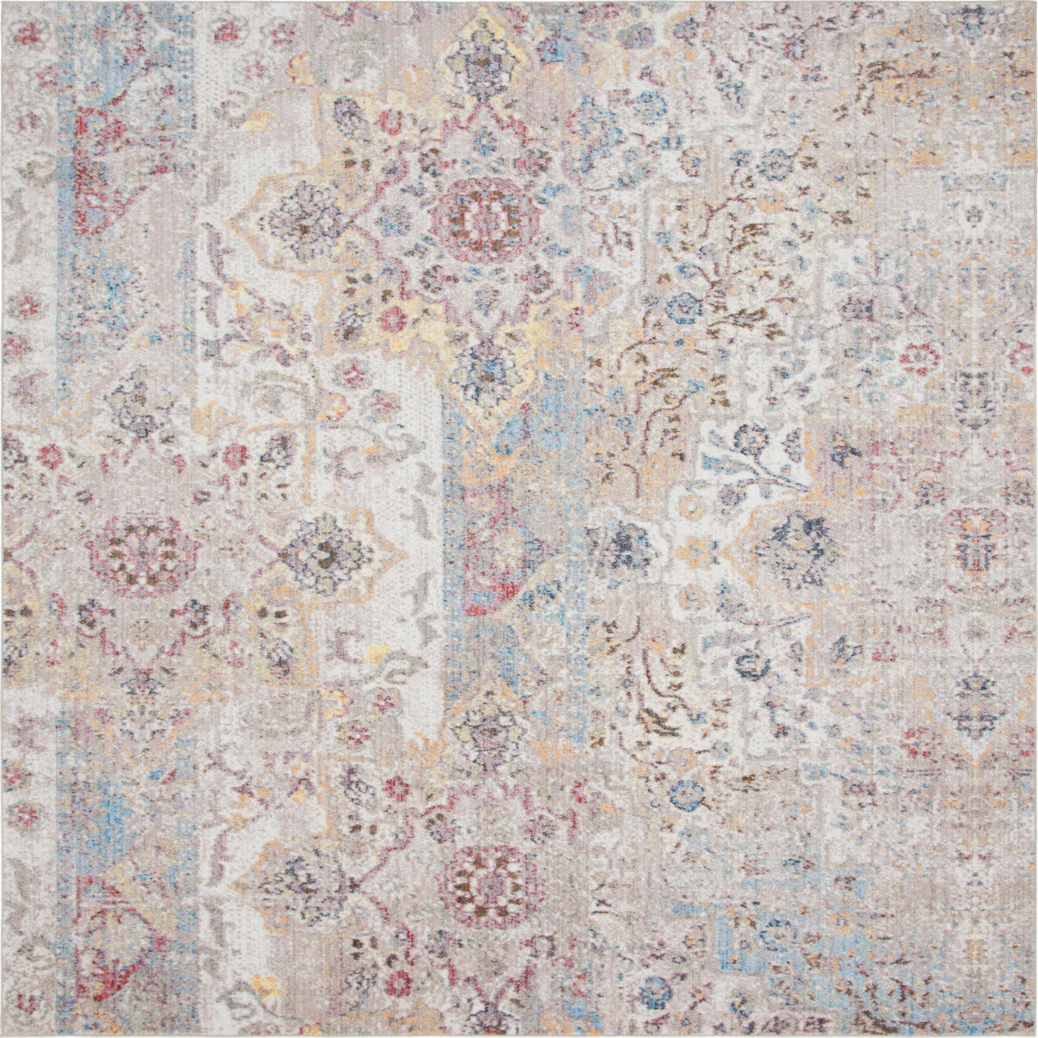 Primary color is Beige. Colors in this rug include: Beige, Blue, Brown, Gold, Gray, Red, Pink.