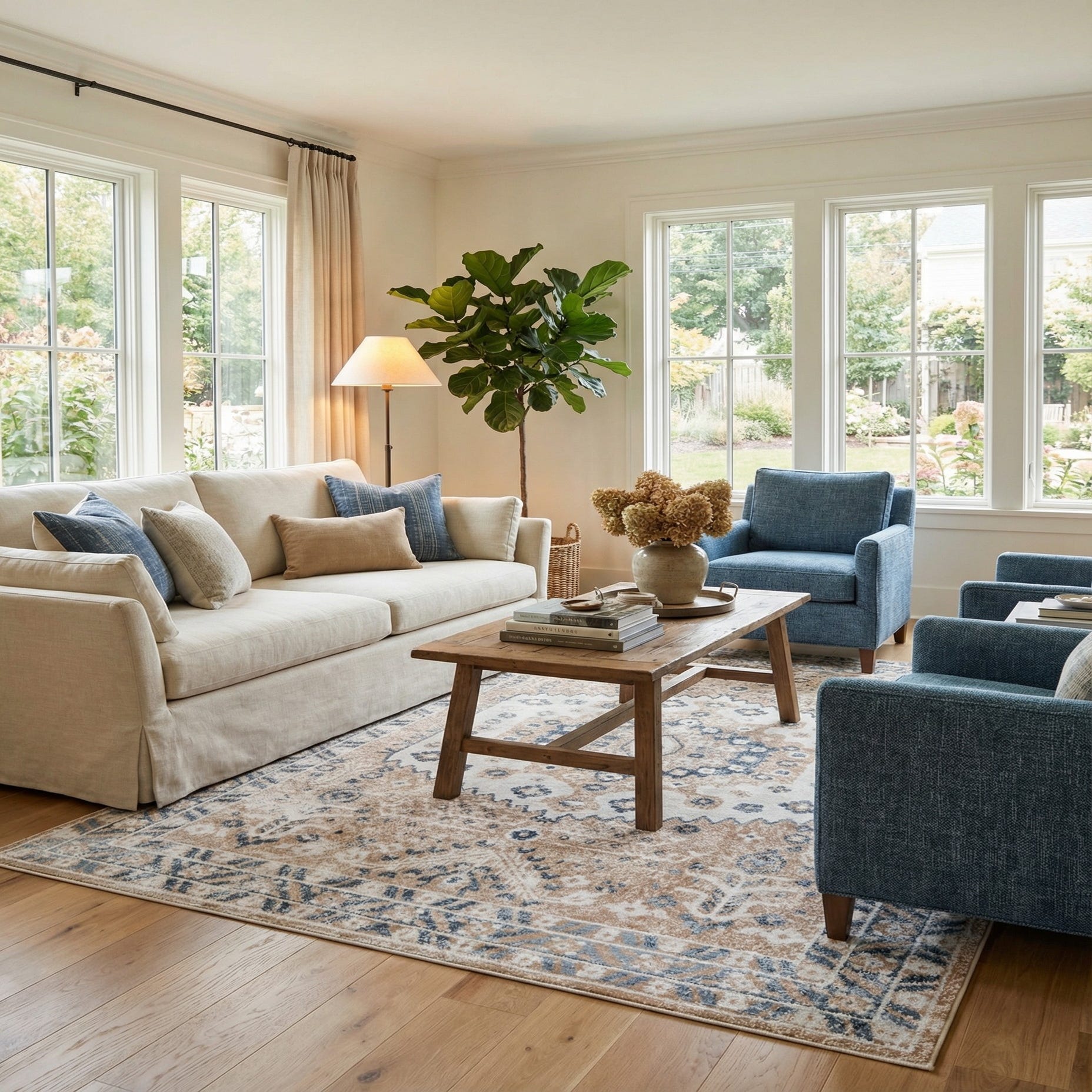 Primary color is Beige. Colors in this rug include: Beige, Navy Blue, Ivory.