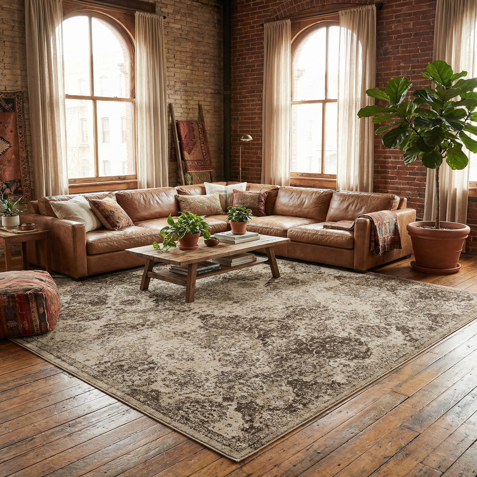 Primary color is Beige. Colors in this rug include: Beige, Brown, Green, Gray, Tan.