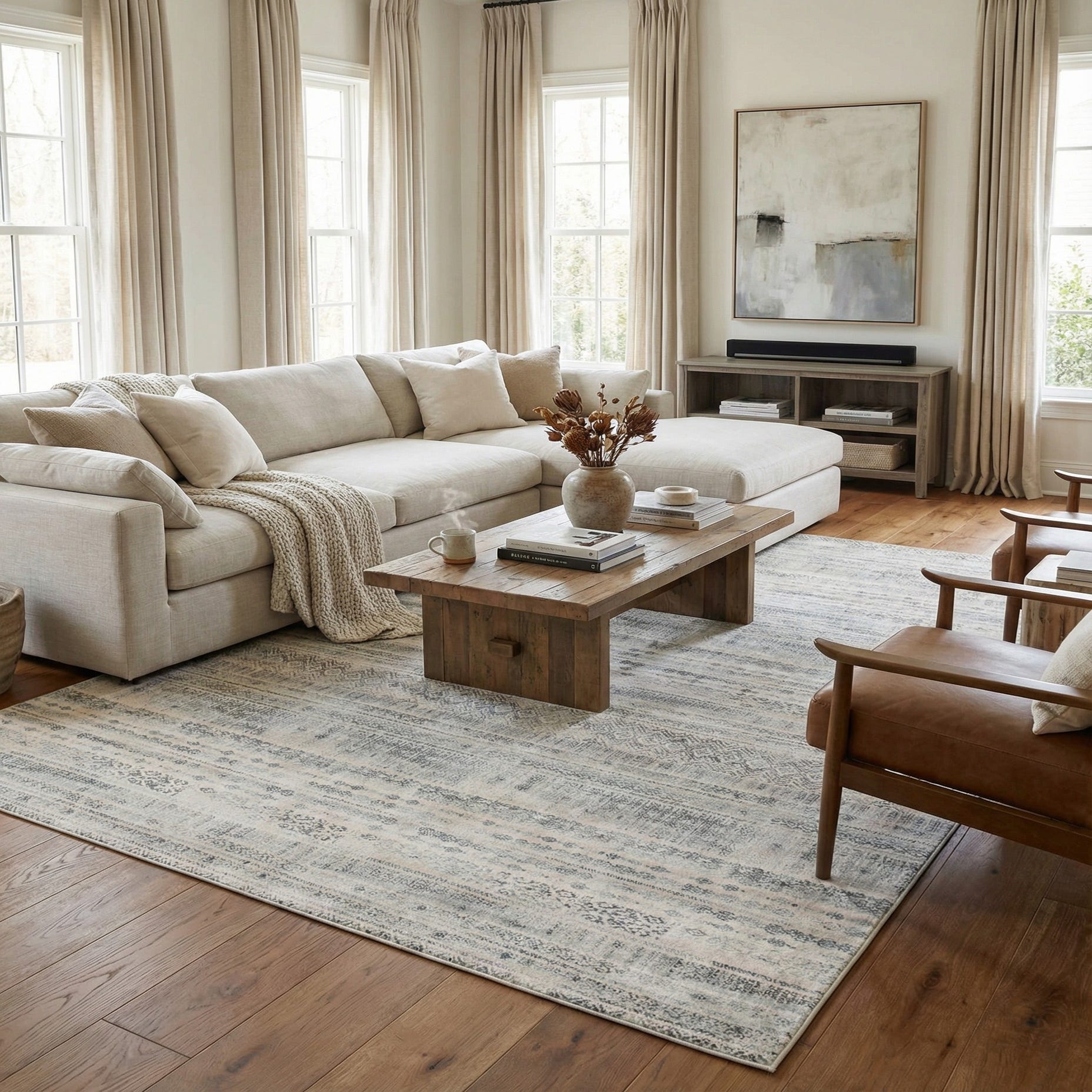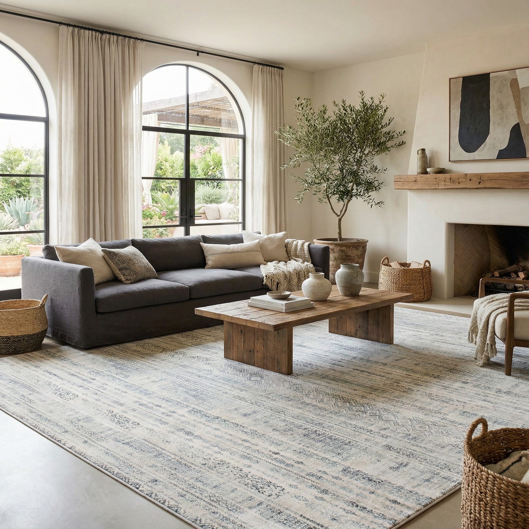 The rug adds color without calling attention to itself. The pattern is subtle not boring. I'm put a matching one in the dining room to pull things together - the variations in color due to the pile make them seem to be two different rugs. The rugs arrive folded but work themselves back to flat quickly. Heavy books on the corners help. I would buy them again in a heartbeat.