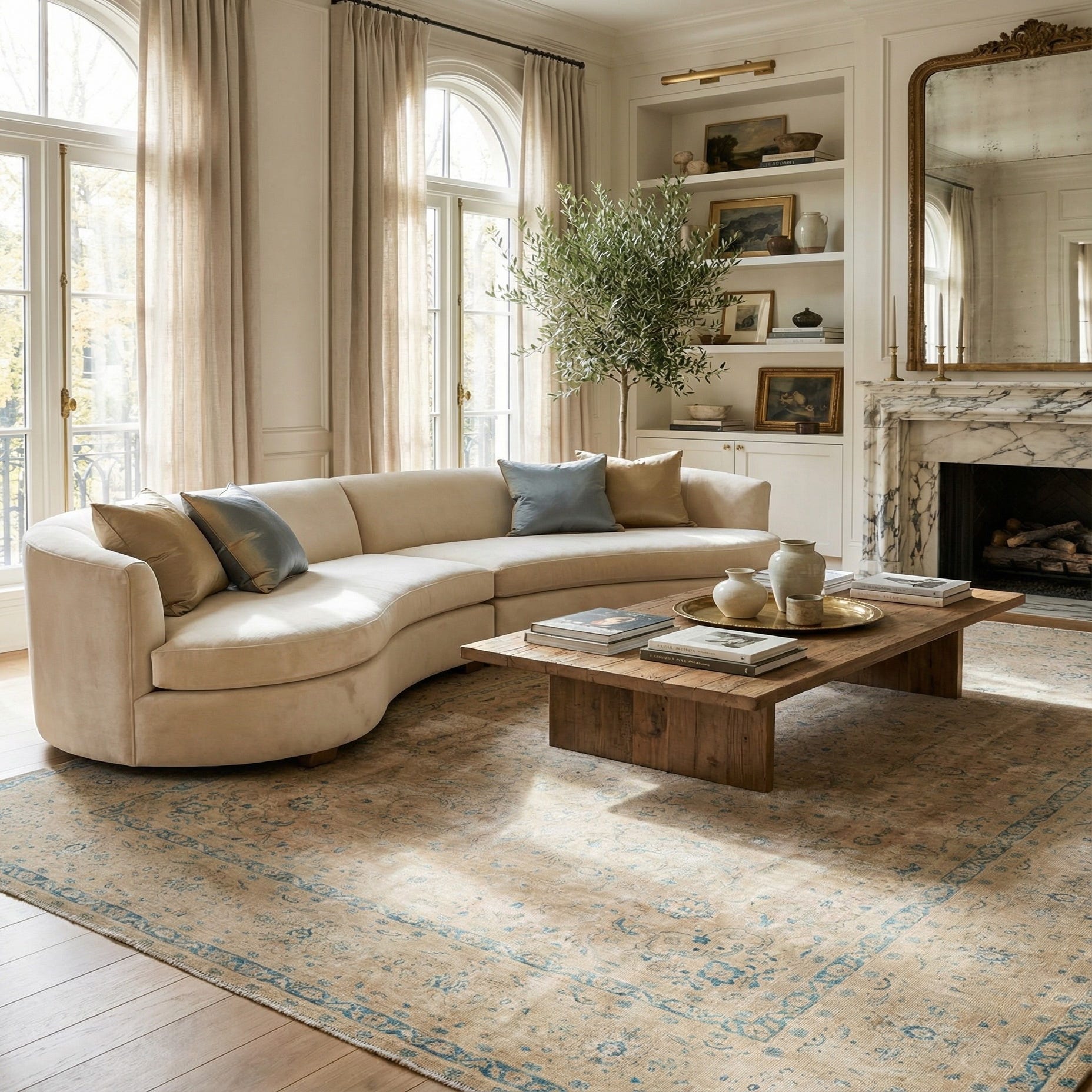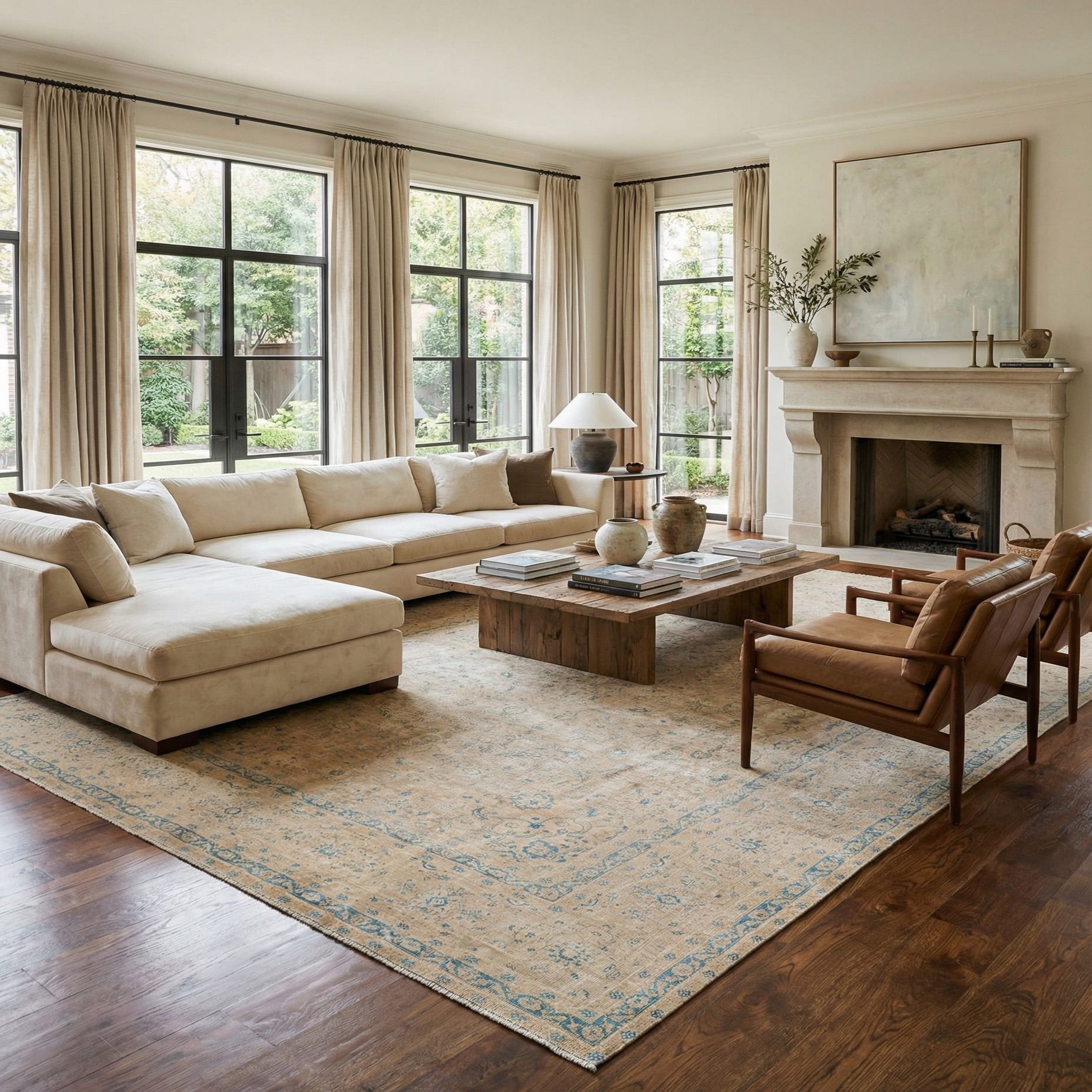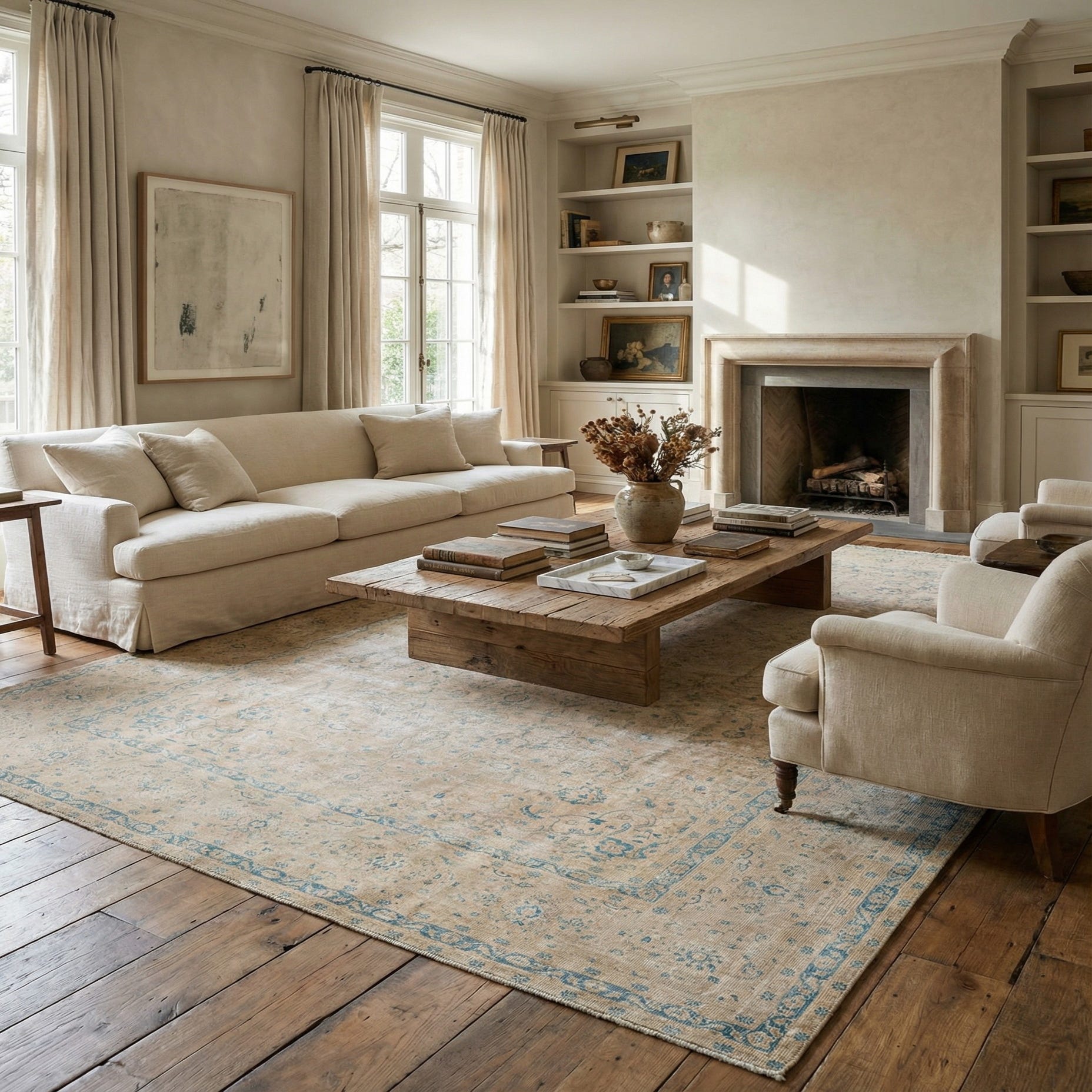 Primary color is Beige. Colors in this rug include: Beige, Blue, Ivory.