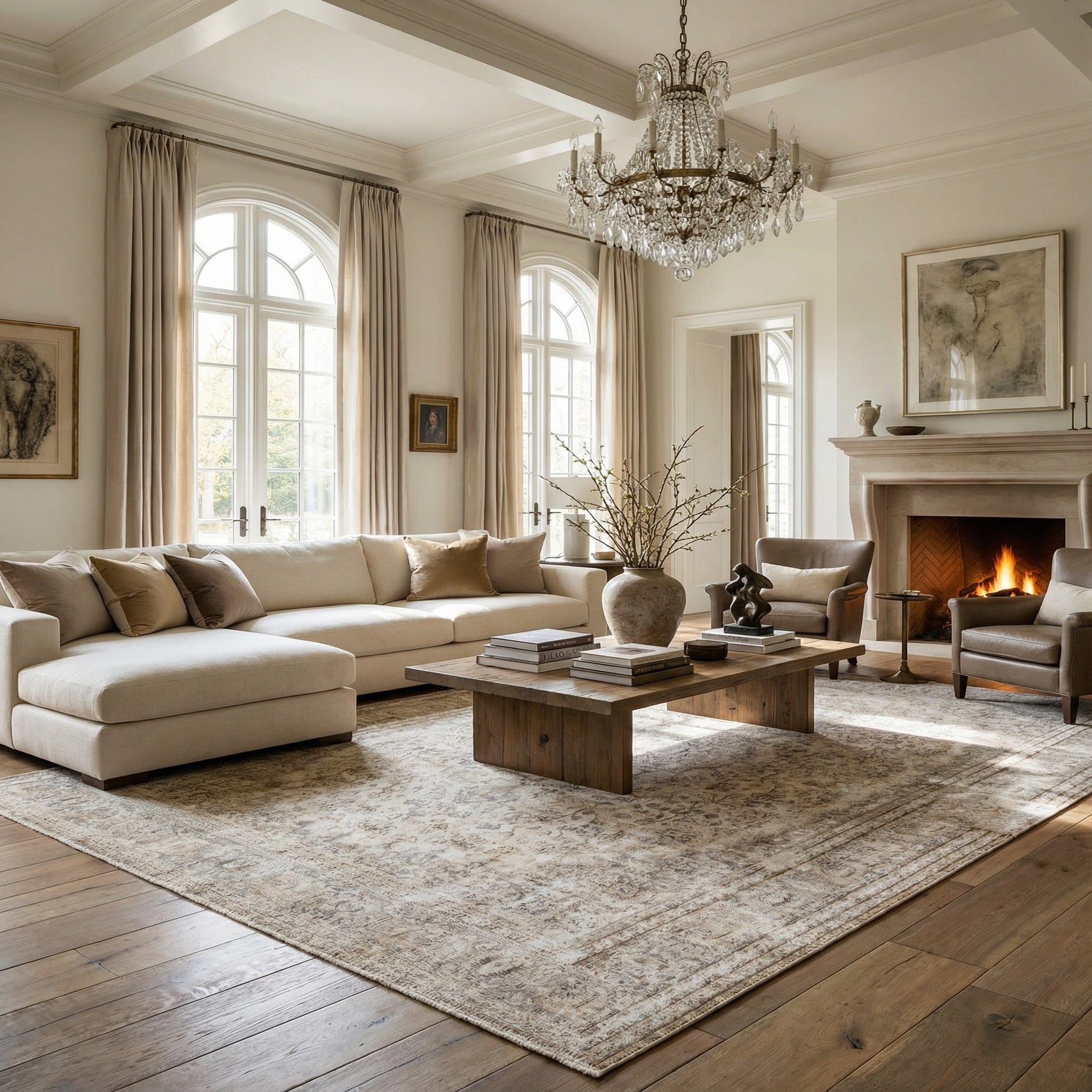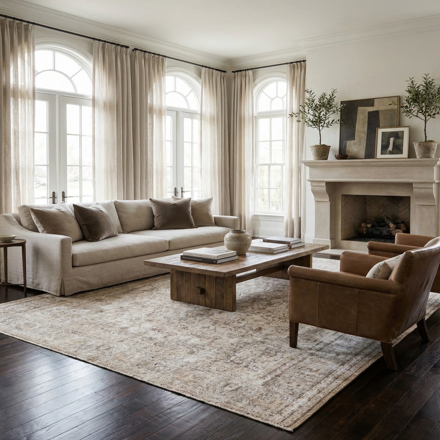 Primary color is Beige. Colors in this rug include: Beige, Brown, Rust Red, Navy Blue.