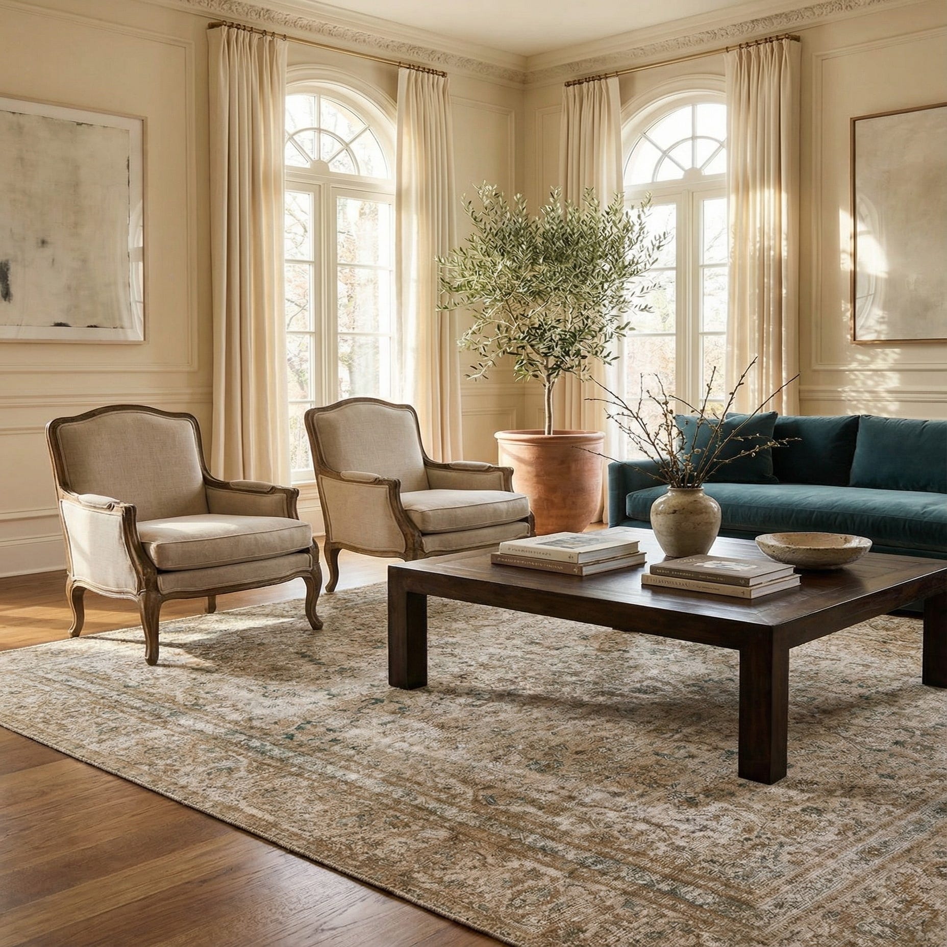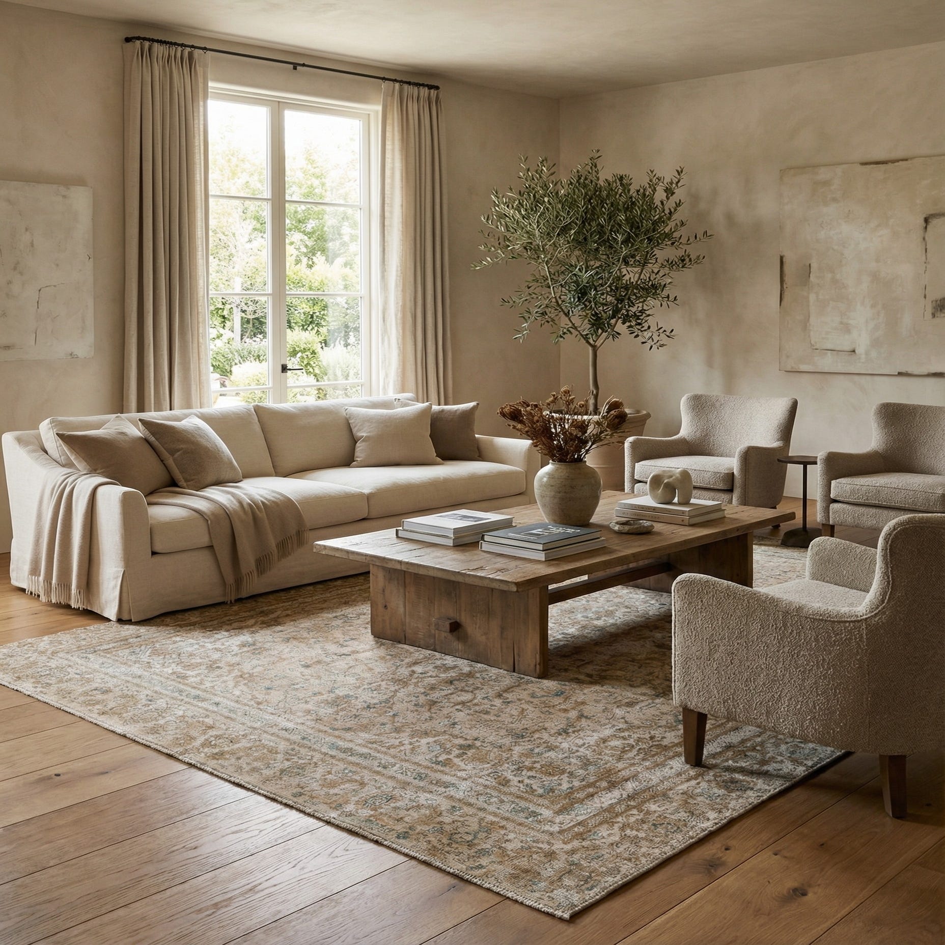 Primary color is Beige. Colors in this rug include: Beige, Brown, Ivory, Navy Blue.