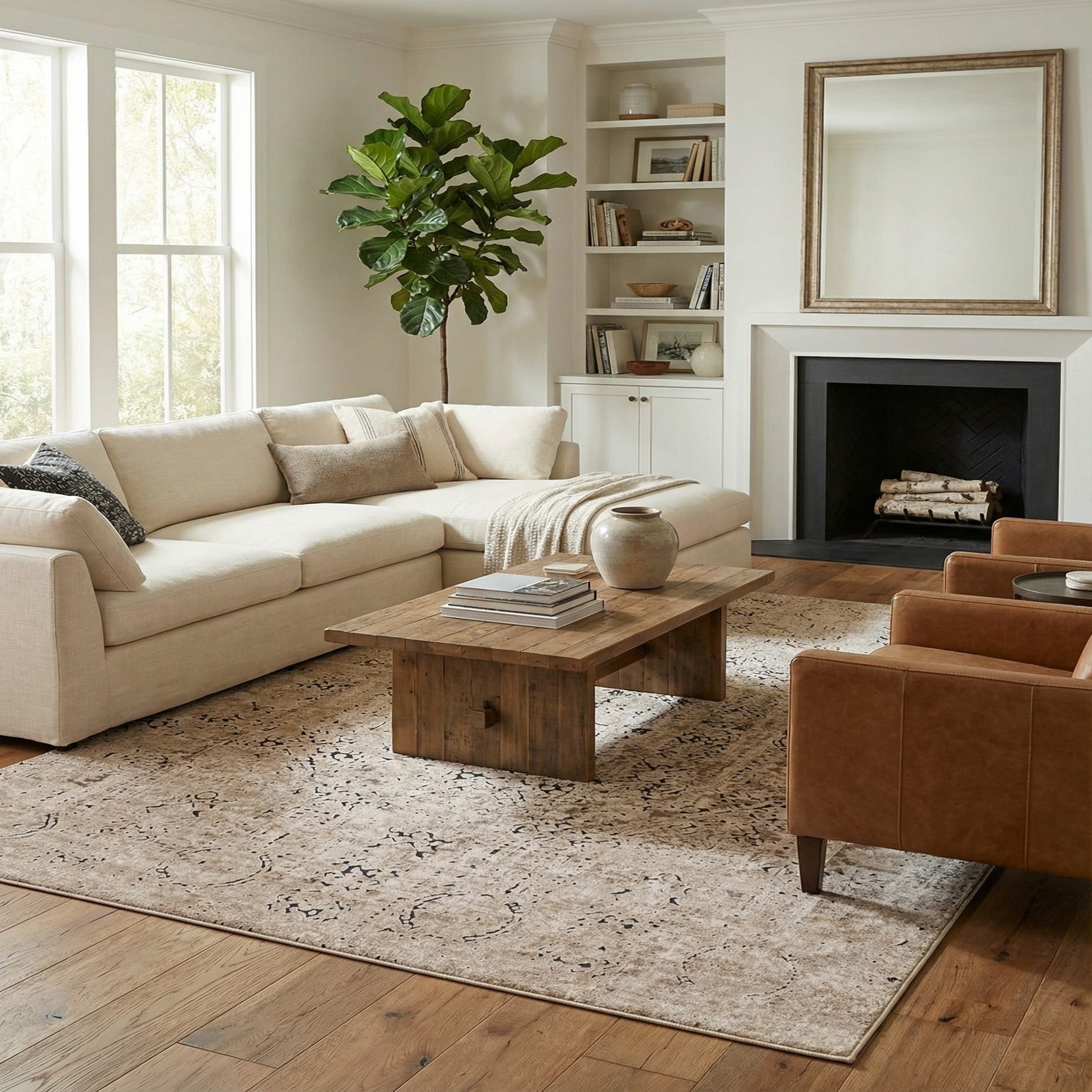 Primary color is Beige. Colors in this rug include: Beige, Brown, Navy Blue.