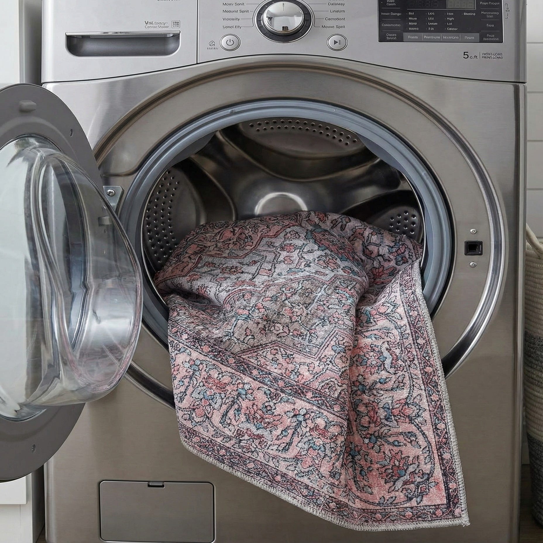 Primary color is Beige and pink. Colors in this rug include: Beige and pink, Gray, Light Blue, Red, Black.