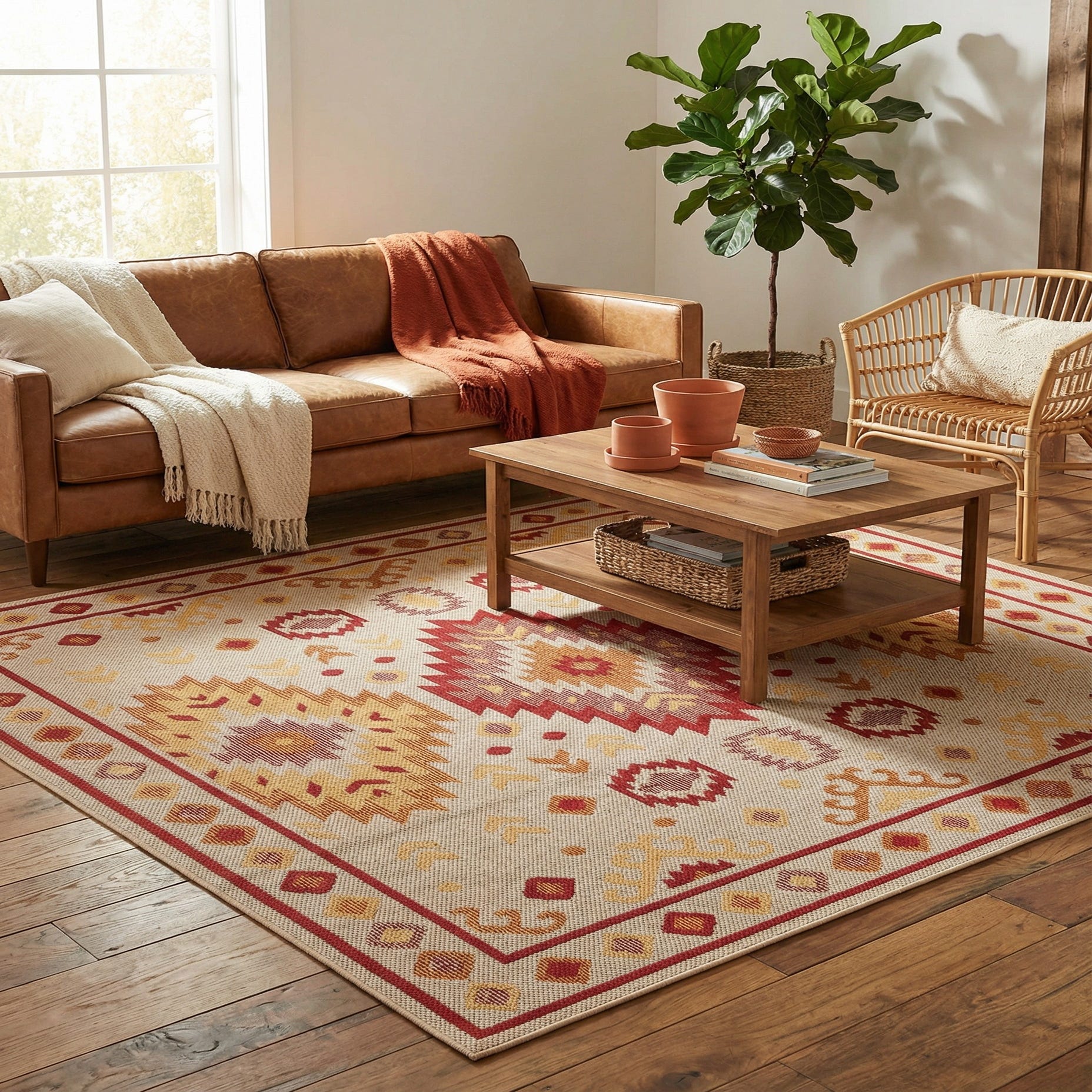 Primary color is Beige and Rust Red. Colors in this rug include: Beige and Rust Red, Yellow.