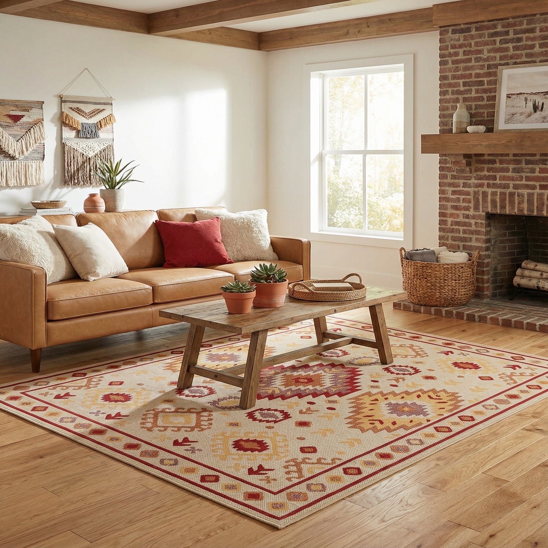 Primary color is Beige and Rust Red. Colors in this rug include: Beige and Rust Red, Orange, Peach, Yellow.
