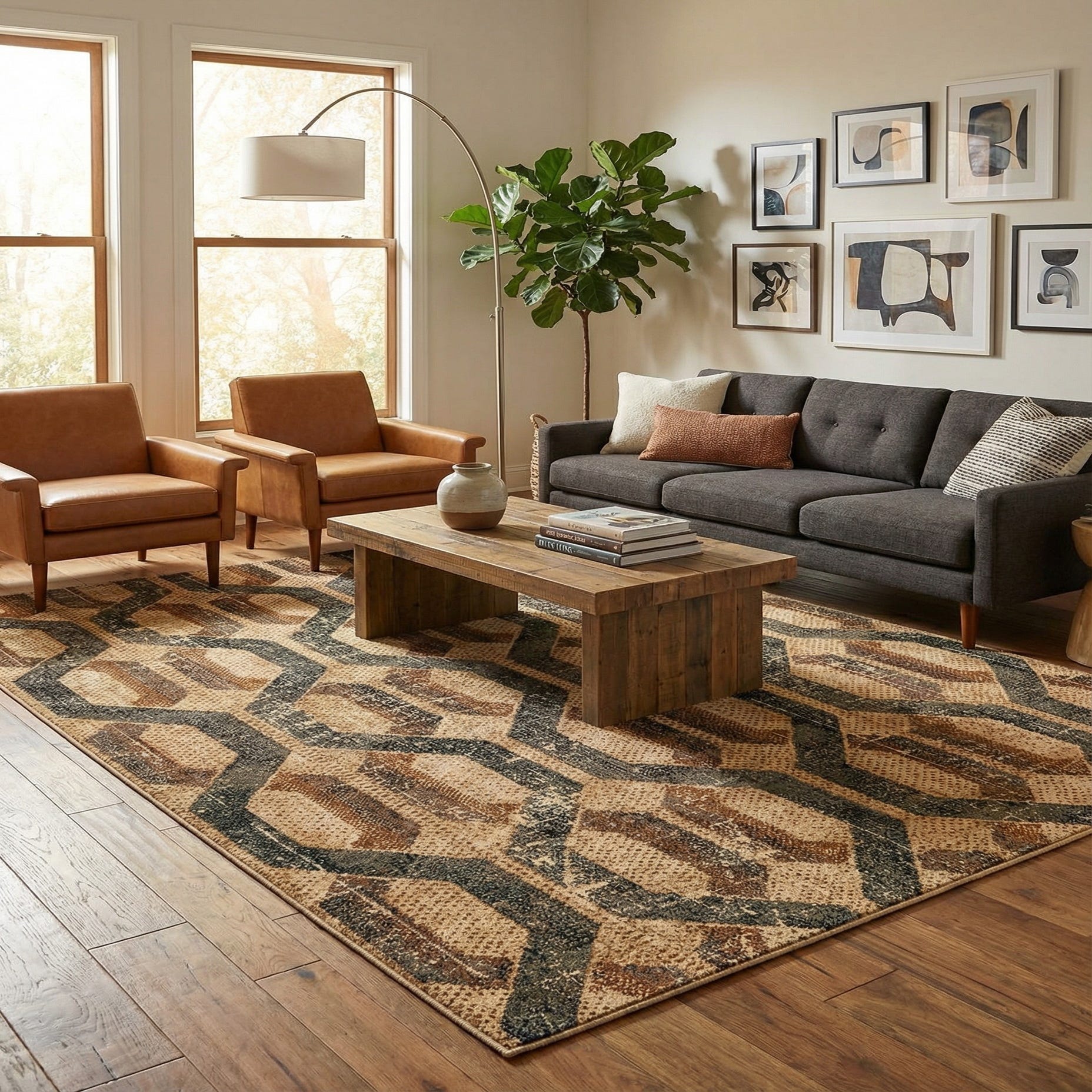 Primary color is Beige Cream. Colors in this rug include: Beige Cream, Black, Brown, Gray, Gold.