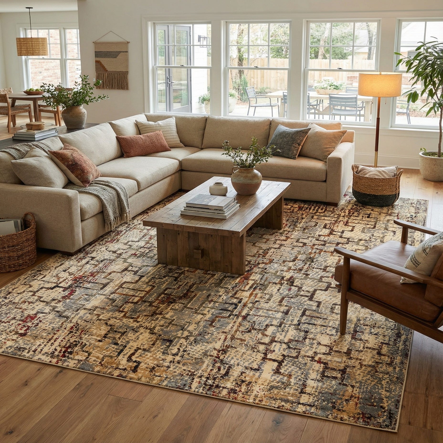Primary color is Beige Cream. Colors in this rug include: Beige Cream, Black, Brown.