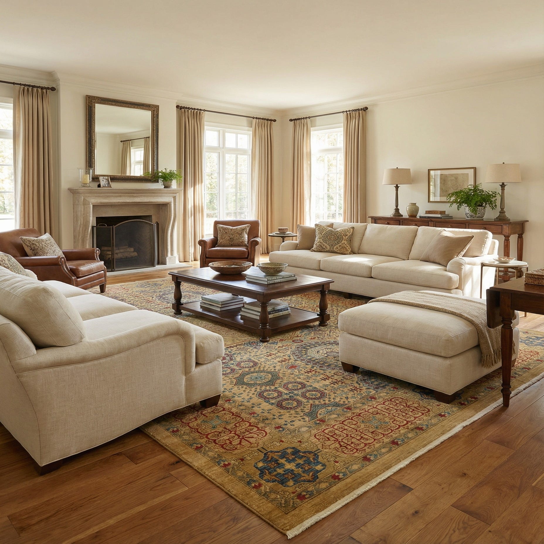 Primary color is Beige. Colors in this rug include: Beige, Light Blue, Light Brown, Light Green, Navy Blue, Red.