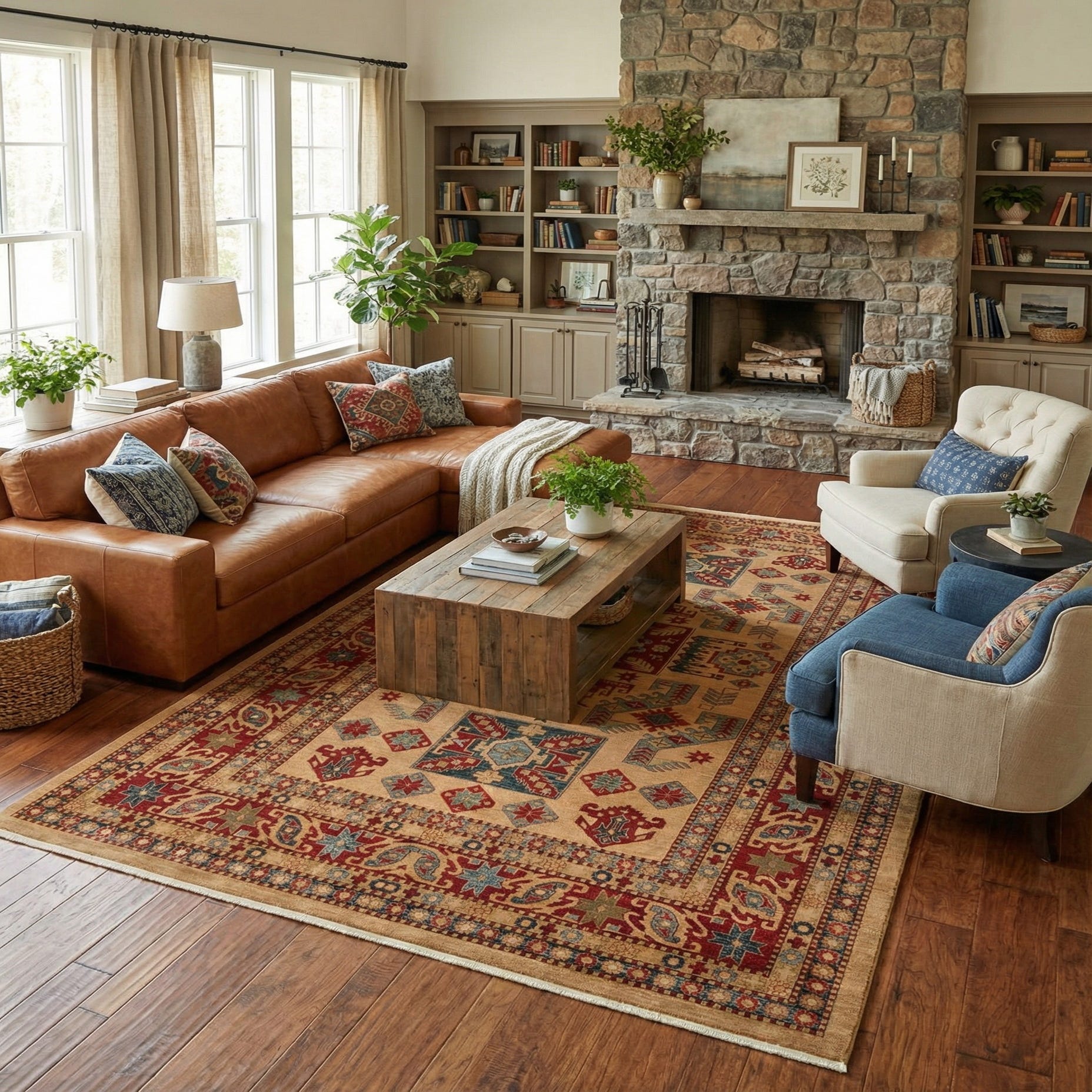 Primary color is Beige. Colors in this rug include: Beige, Light Blue, Light Brown, Light Green, Red, Blue.