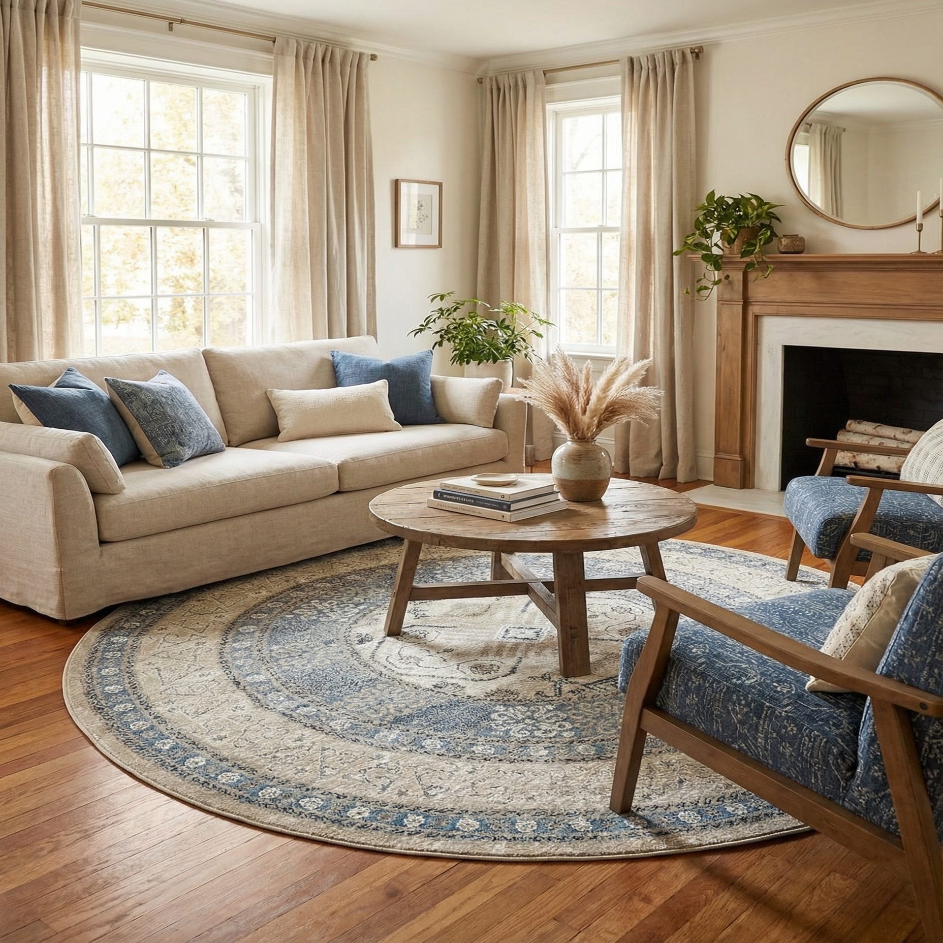 Primary color is Beige. Colors in this rug include: Beige, Ivory, Light Blue.