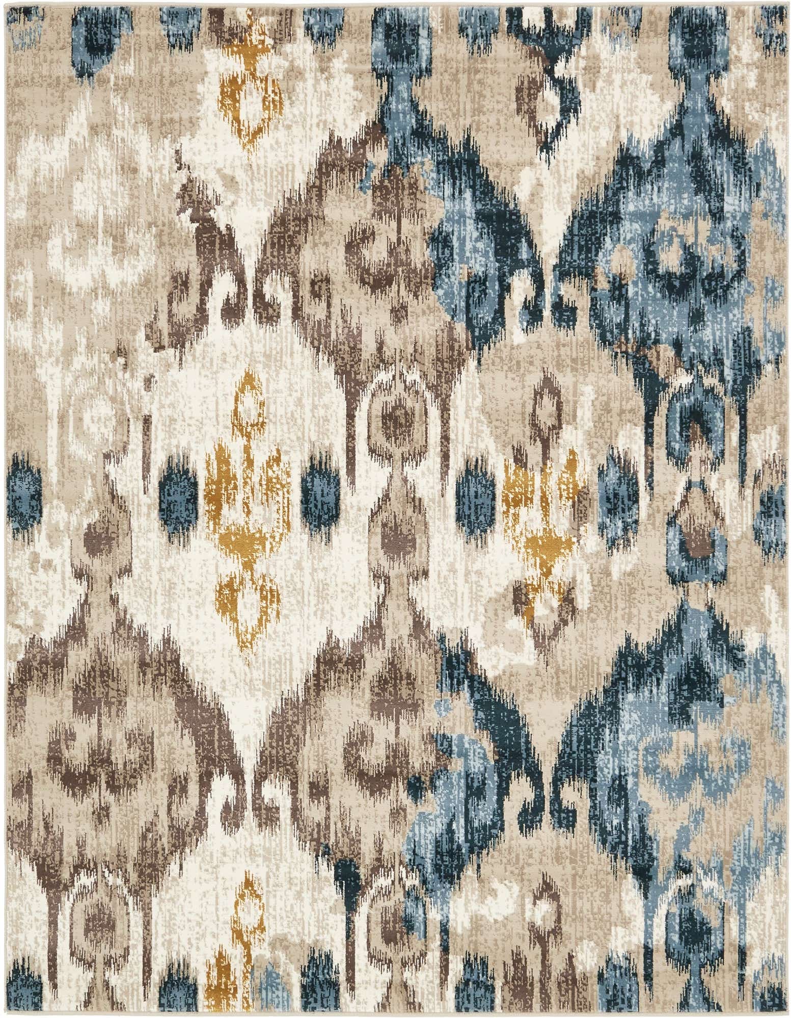 Primary color is Beige. Colors in this rug include: Beige, Blue, Brown, Gold, Light Blue, Light Brown, Ivory.