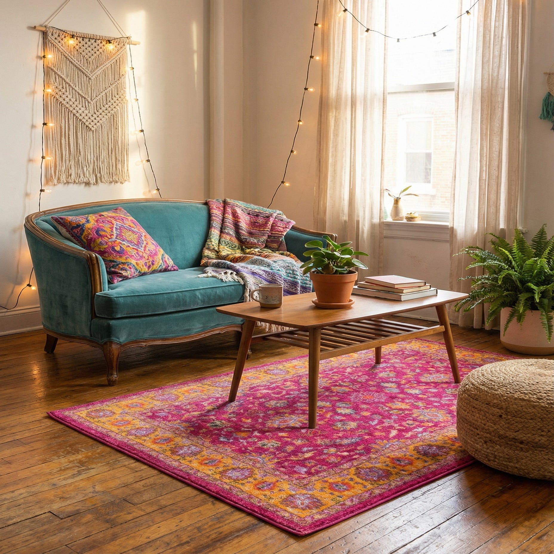 Primary color is Berry Pink. Colors in this rug include: Berry Pink, Blue, Yellow, Ivory, Violet.