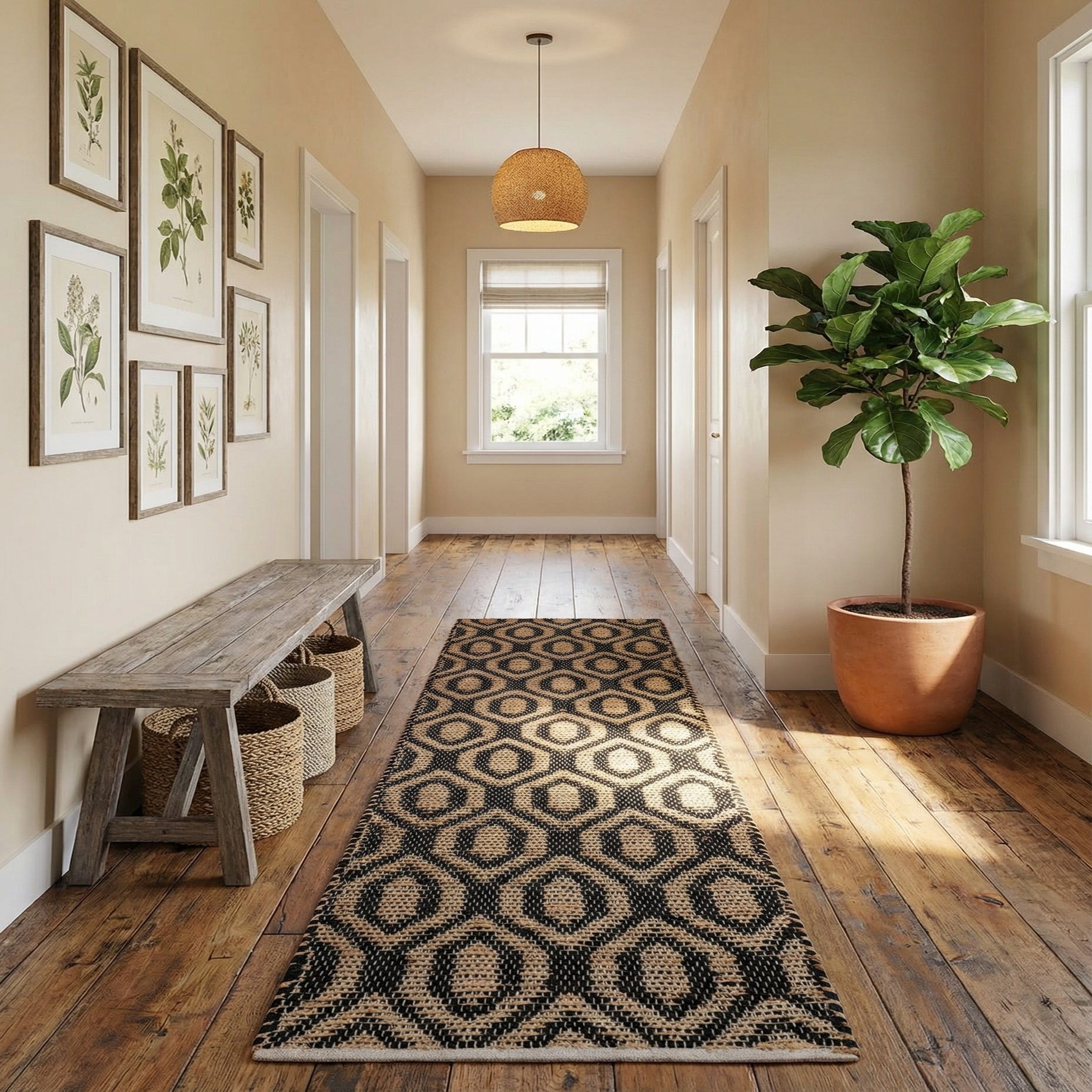 Primary color is Black. Colors in this rug include: Black, Natural.