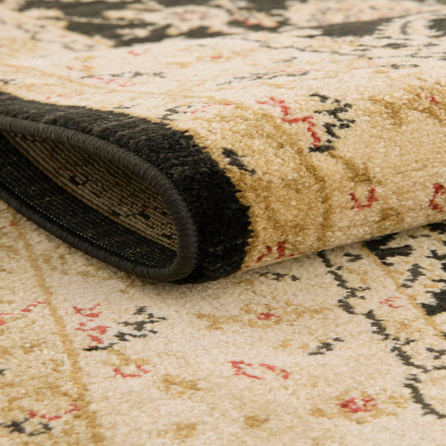 Primary color is Black. Colors in this rug include: Black, Cream, Light Brown, Rust Red.