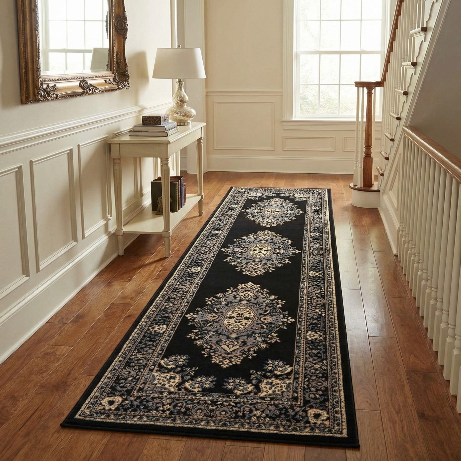 Primary color is Black. Colors in this rug include: Black, Beige, Light Blue.