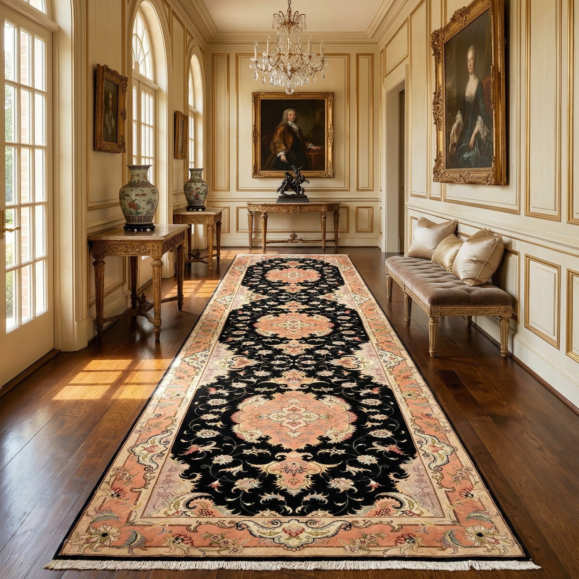 Primary color is Black. Colors in this rug include: Black, Black, Pink, Beige, Grey, Green.