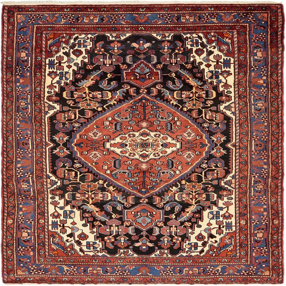 Primary color is Black. Colors in this rug include: Black, Blue, Green, Ivory, Navy Blue, Olive, Red.