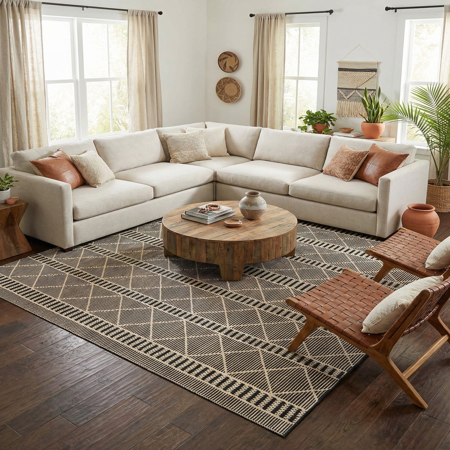 Primary color is Black. Colors in this rug include: Black, Ivory.