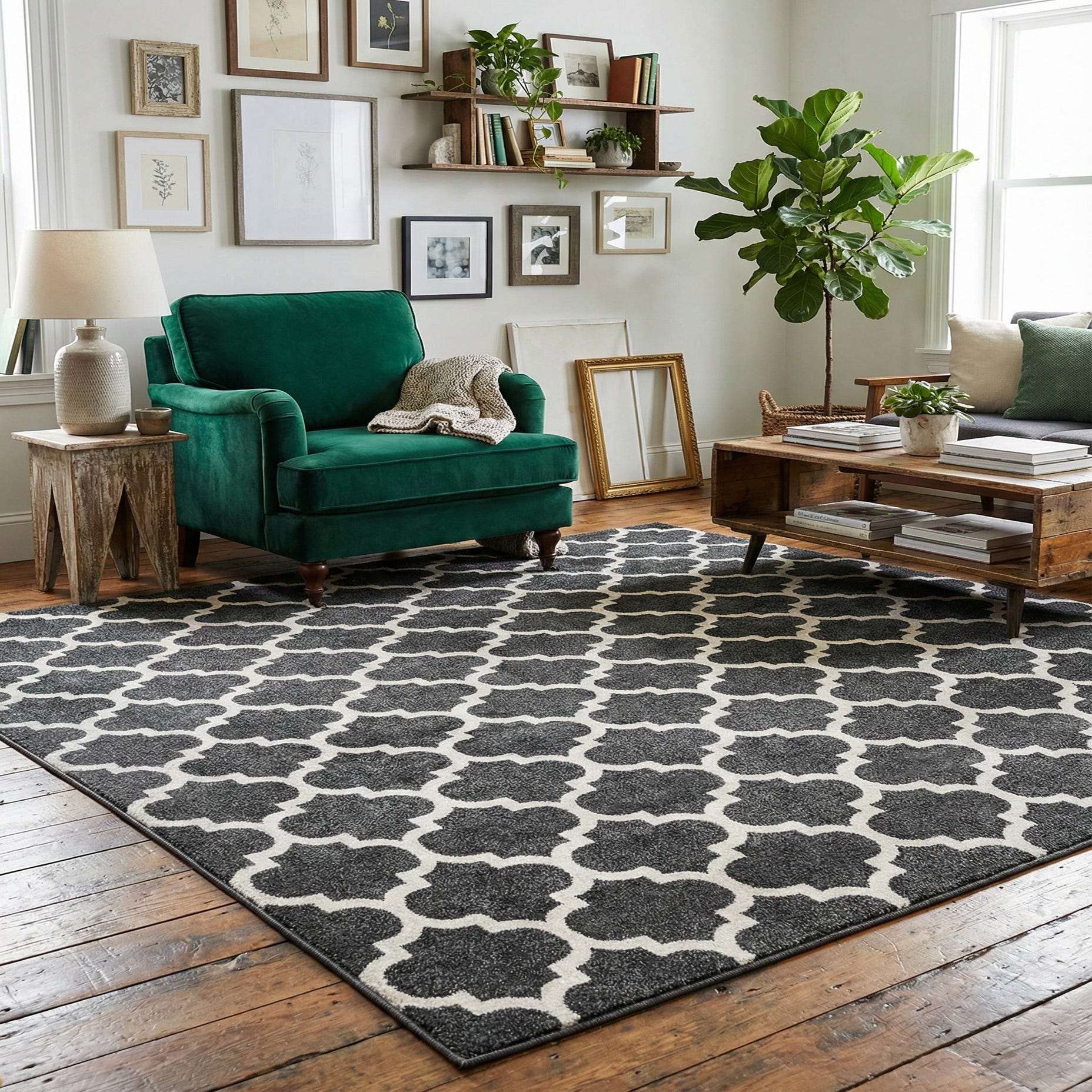 Primary color is Black. Colors in this rug include: Black, Beige.