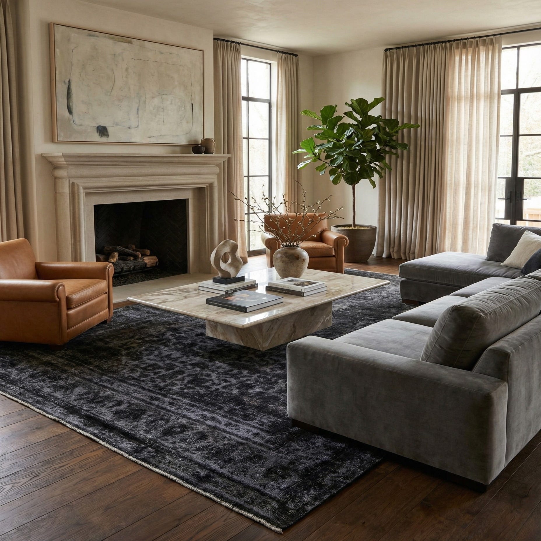 Primary color is Black. Colors in this rug include: Black, Gray.