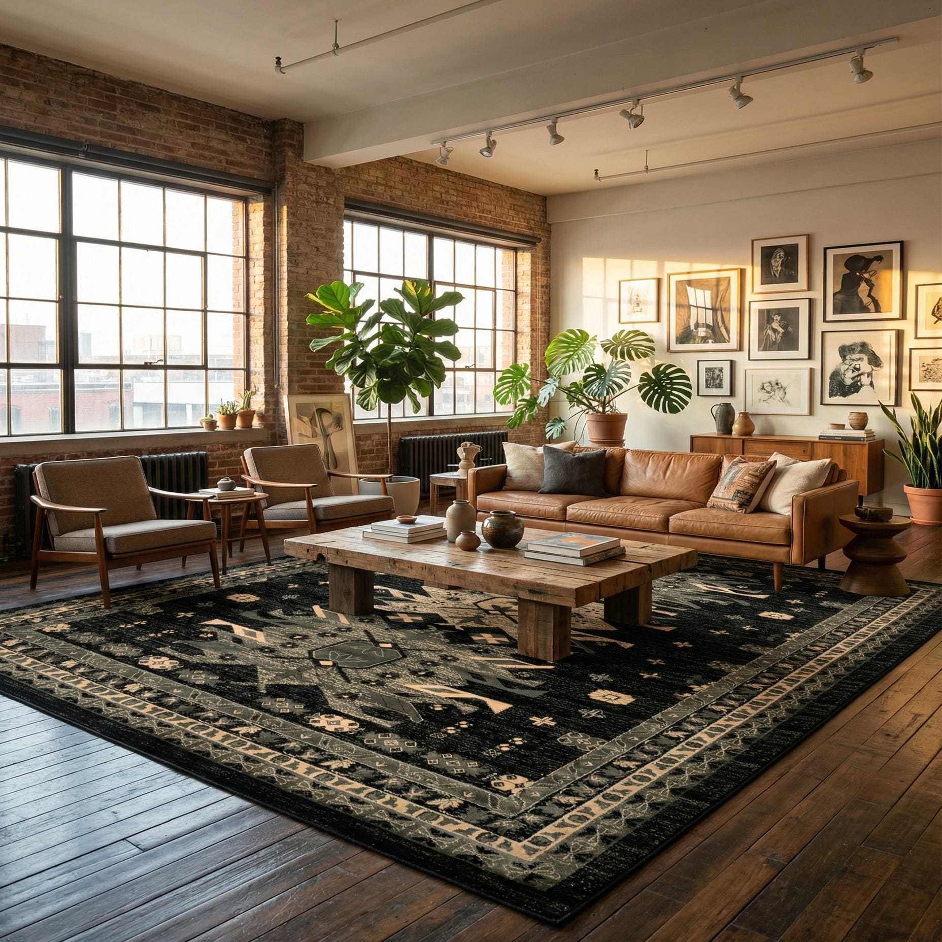 Primary color is Black. Colors in this rug include: Black, Cream, Gray.