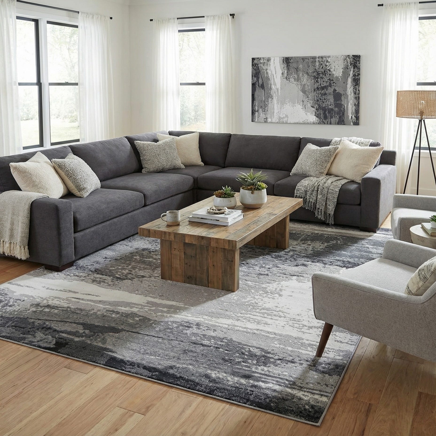 Primary color is Black. Colors in this rug include: Black, Ivory, Gray.