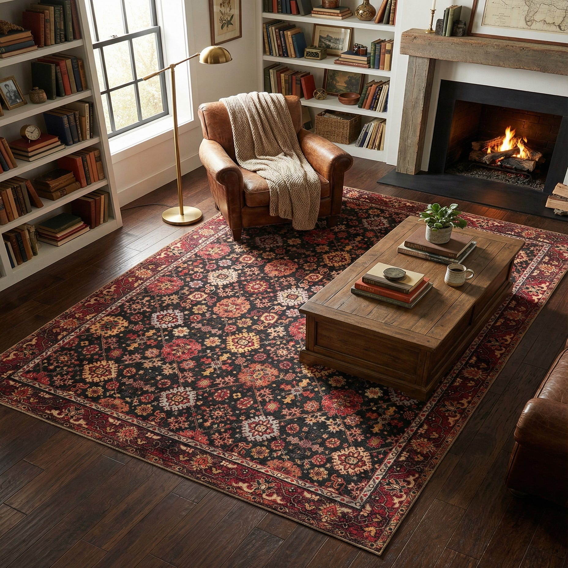 Primary color is Black. Colors in this rug include: Black, Gold, Orange, Yellow, Red, Ivory.