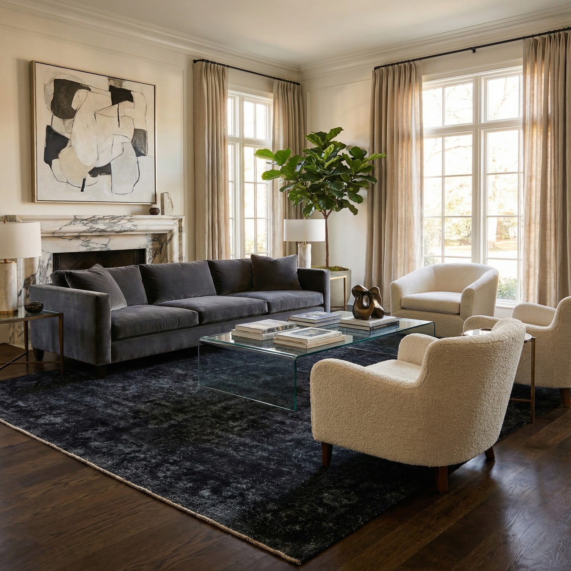 Primary color is Black. Colors in this rug include: Black, Ivory.