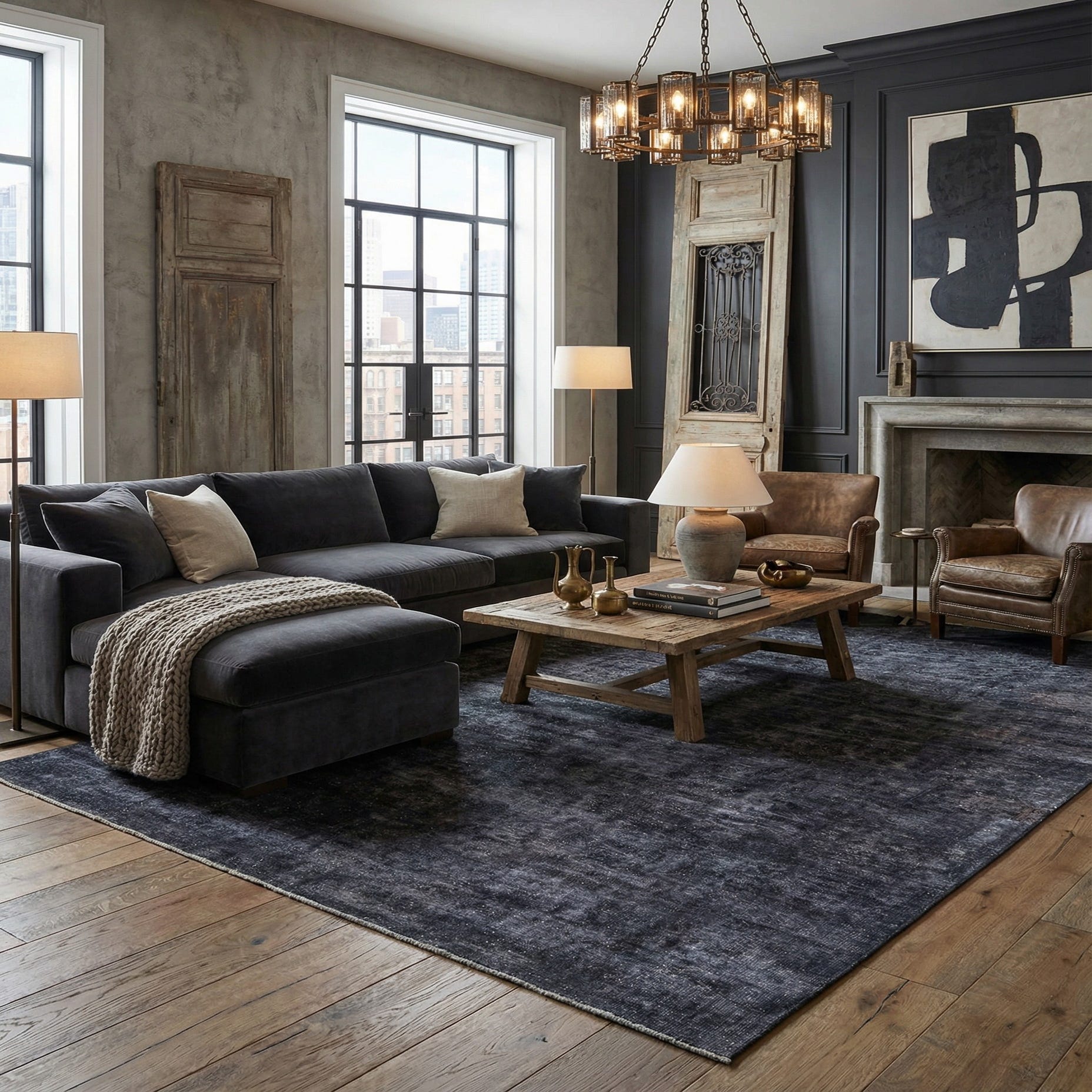 Primary color is Black. Colors in this rug include: Black, Blue.