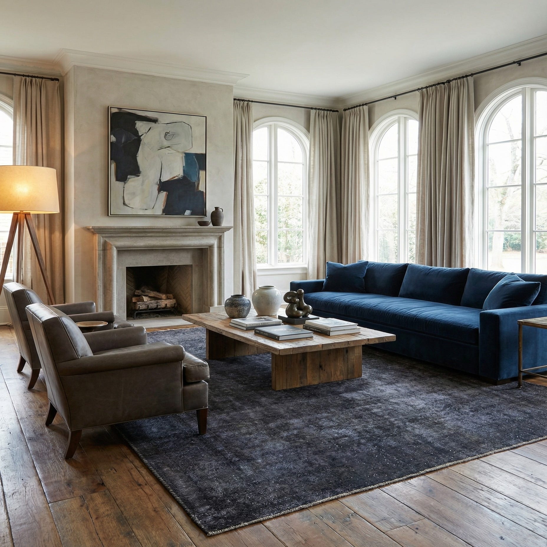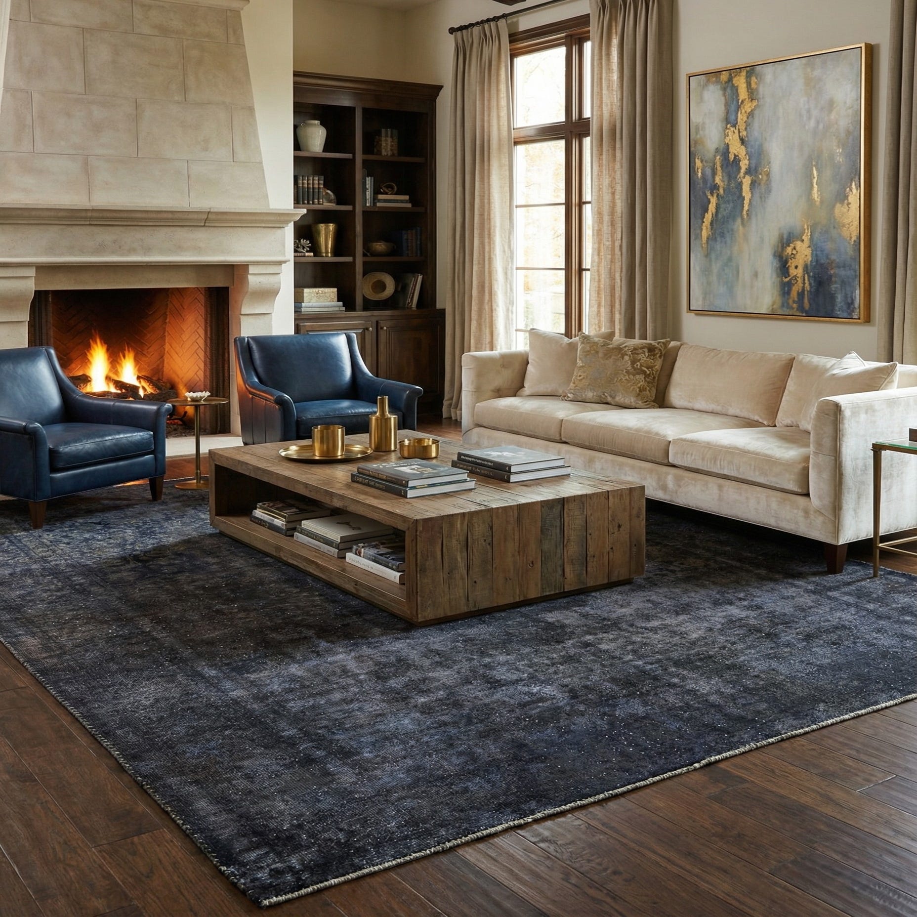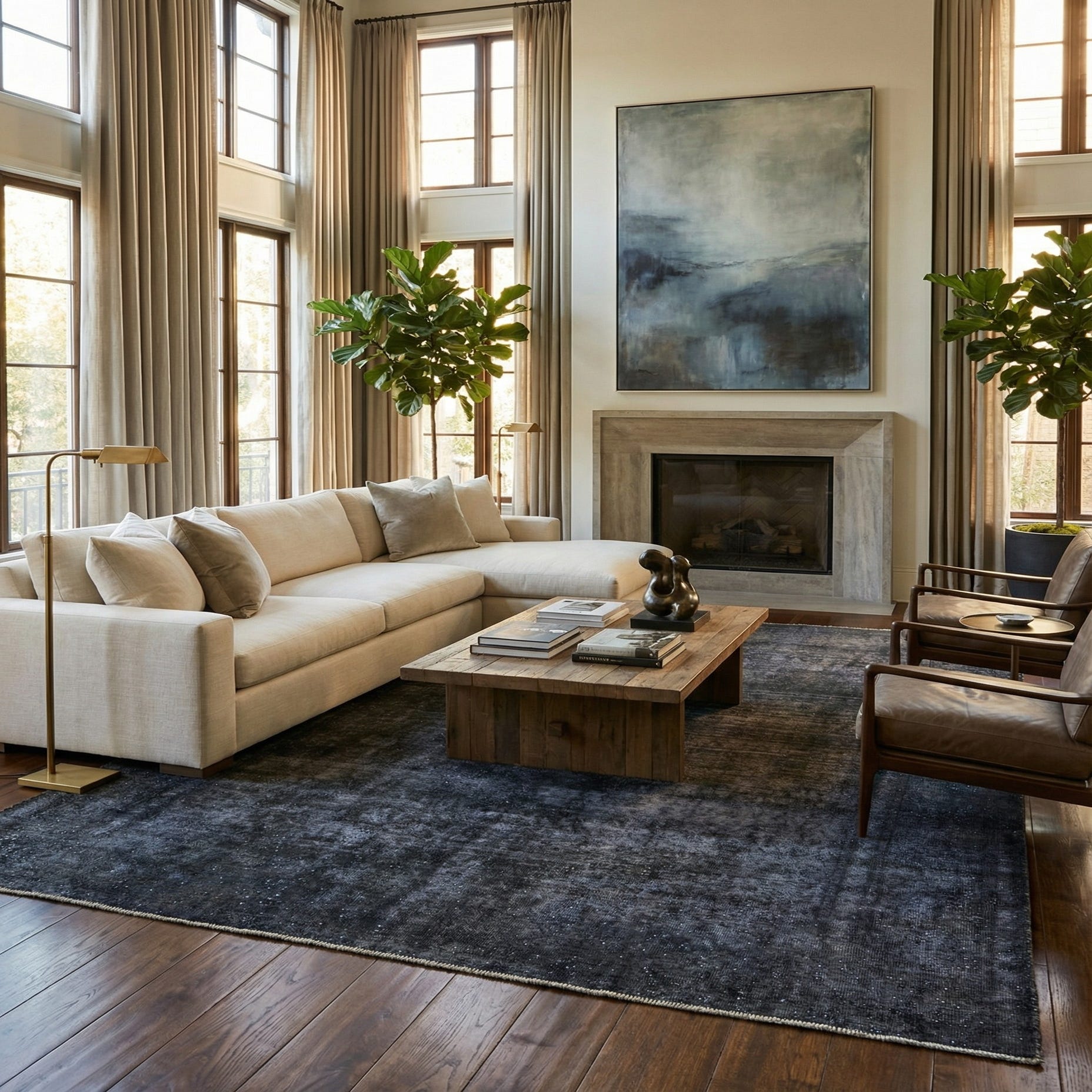 Primary color is Black. Colors in this rug include: Black, Navy Blue, Gray.