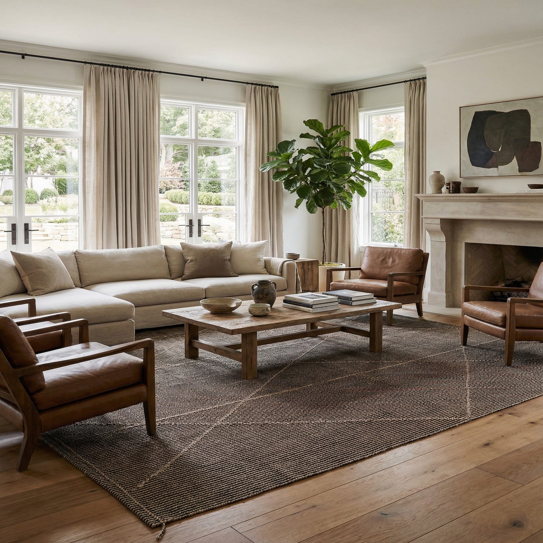 Primary color is Black. Colors in this rug include: Black, Natural.