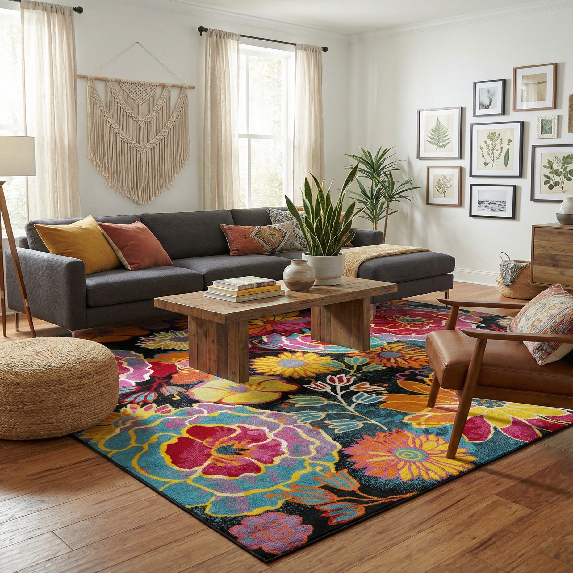 Primary color is Black. Colors in this rug include: Black, Blue, Green, Ivory, Orange, Red, Yellow.