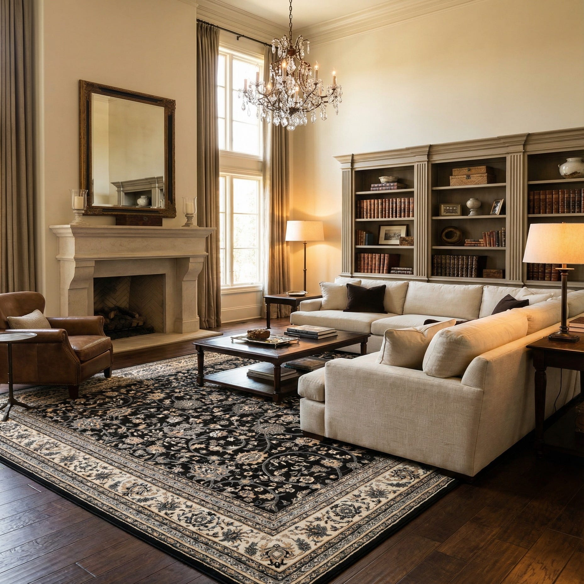 Primary color is Black. Colors in this rug include: Black, Gray, Ivory, Tan.