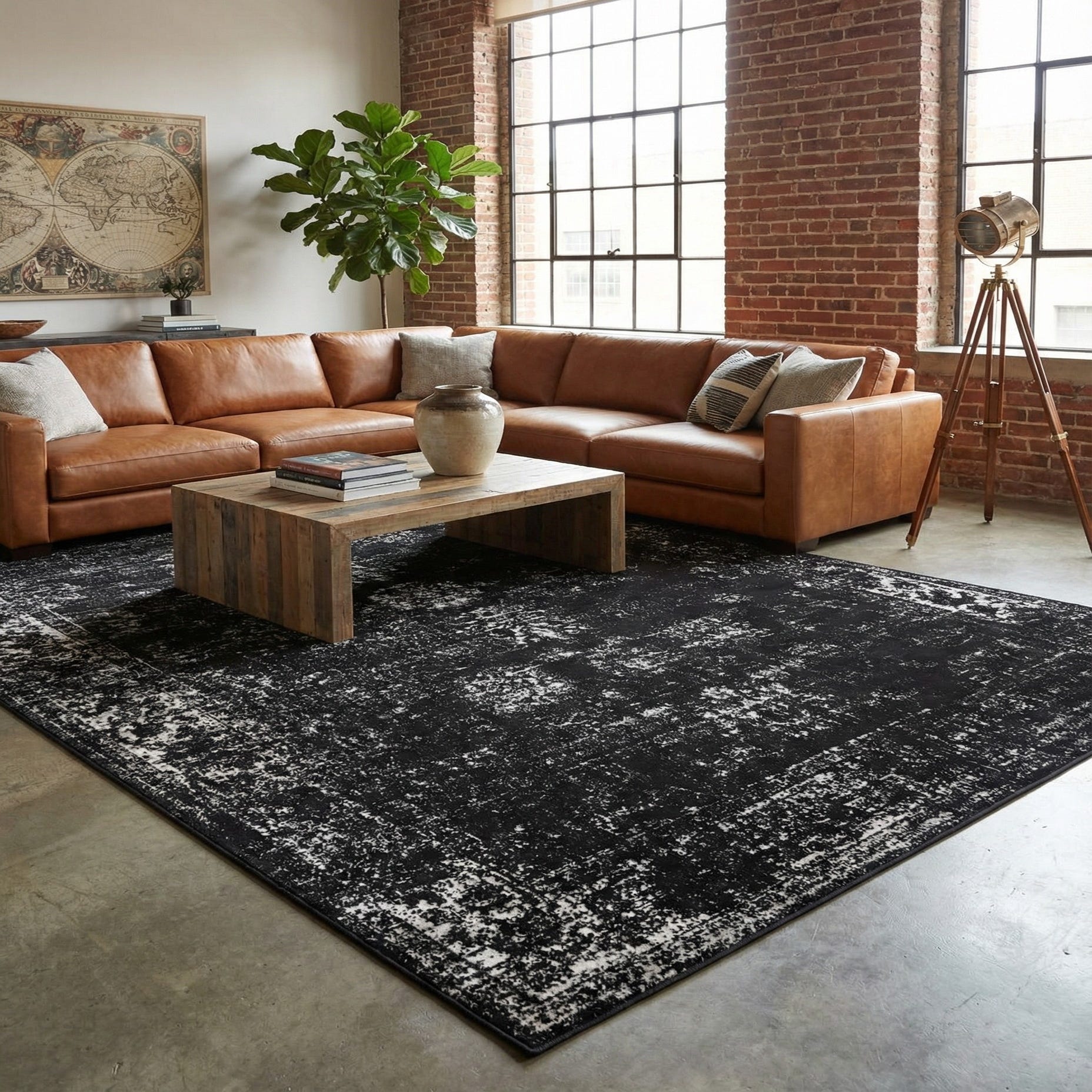 Primary color is Black. Colors in this rug include: Black, Gray, Ivory.