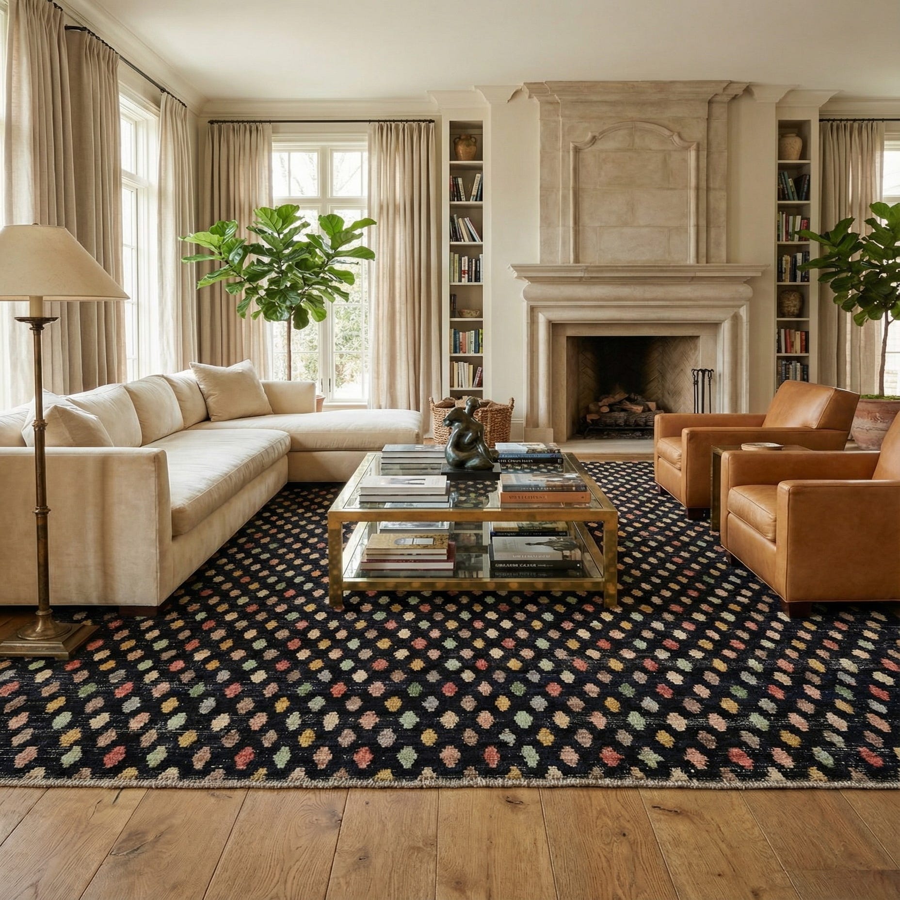Primary color is Black. Colors in this rug include: Black, Light Green, Red, Beige, Yellow.