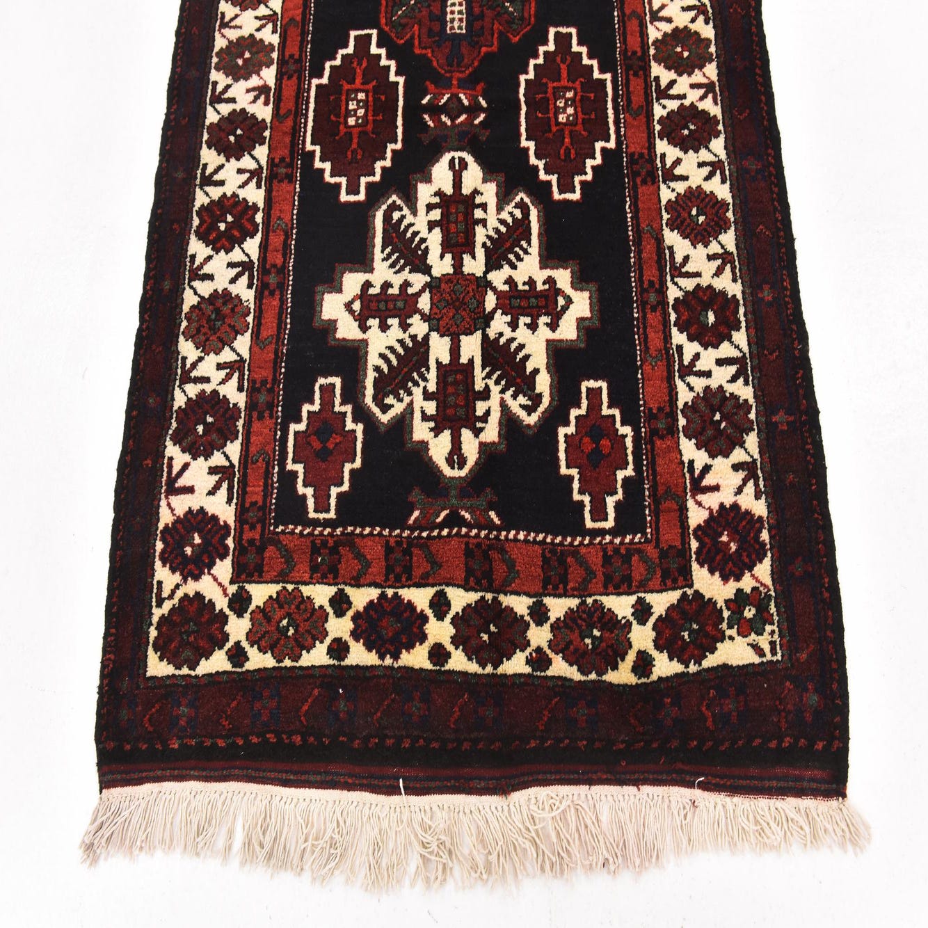 Primary color is Black. Colors in this rug include: Black, Blue, Ivory, Navy Blue, Puce, Red, Gray, Green.