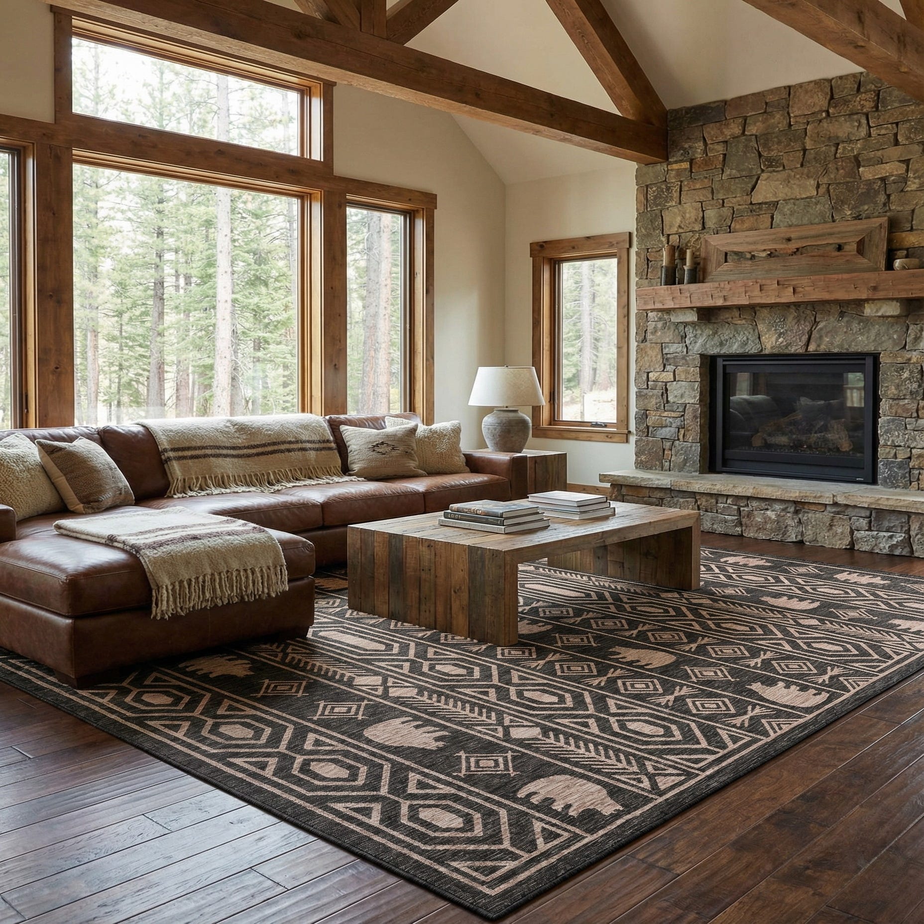 Primary color is Black. Colors in this rug include: Black, Brown.