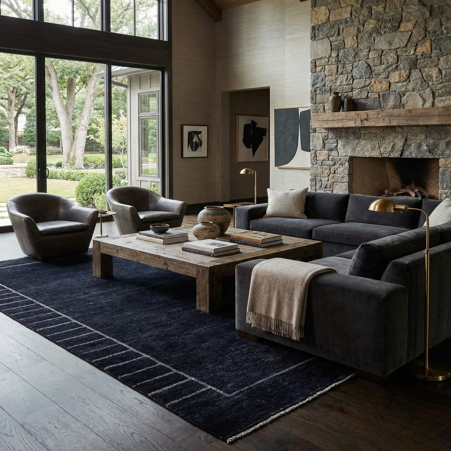 Primary color is Black. Colors in this rug include: Black, Blue, Brown, Ivory.