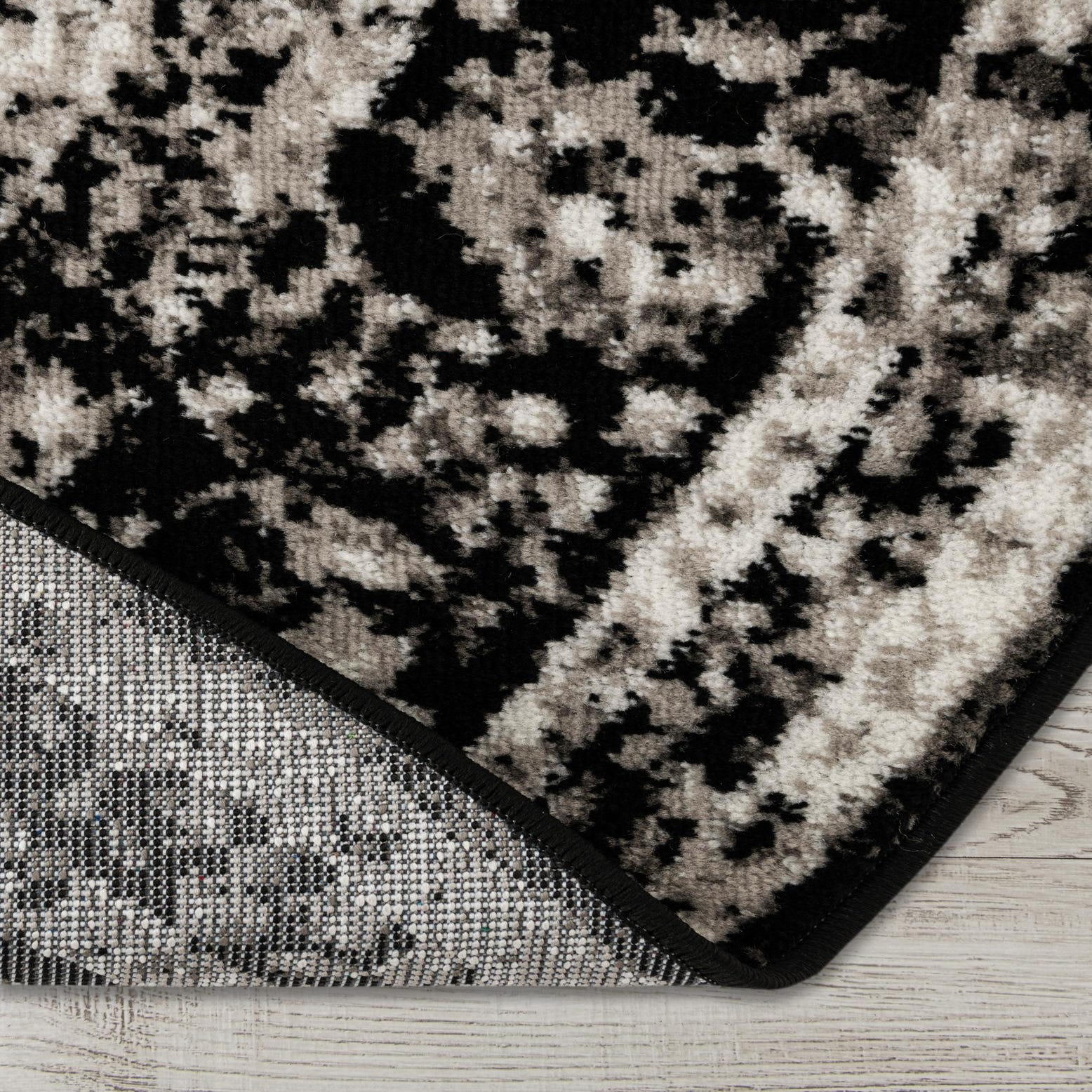 Primary color is Black. Colors in this rug include: Black, Gray, Ivory.