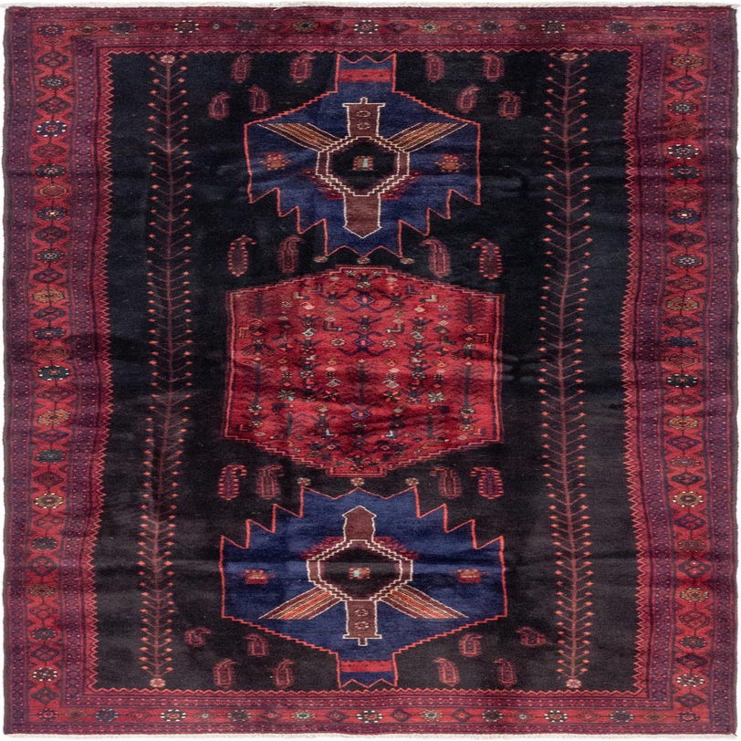 Primary color is Black. Colors in this rug include: Black, Beige, Brown, Burgundy, Green, Orange, Red, Hunter Green.