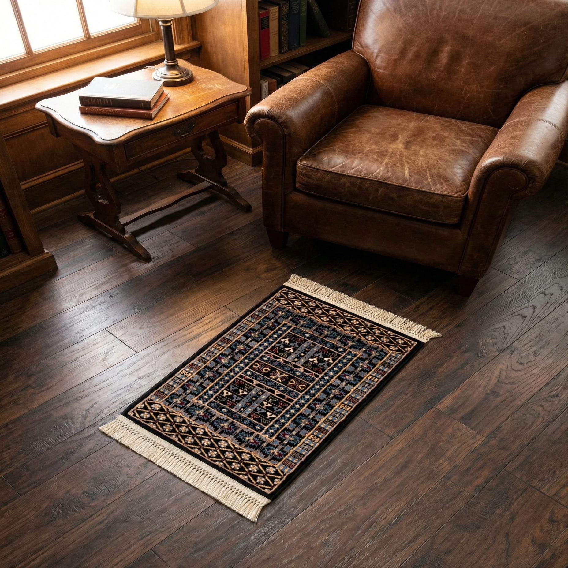 Primary color is Black. Colors in this rug include: Black, Beige, Blue, Brown, Green, Red.