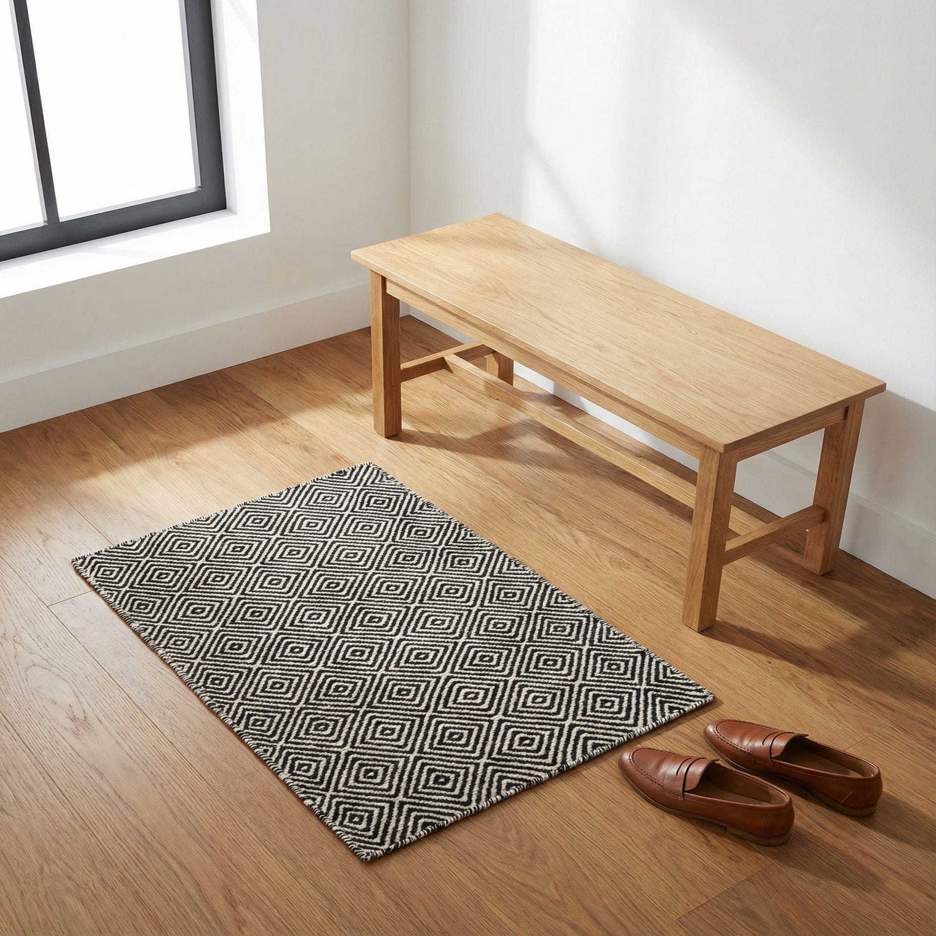 Primary color is Black. Colors in this rug include: Black, Ivory.