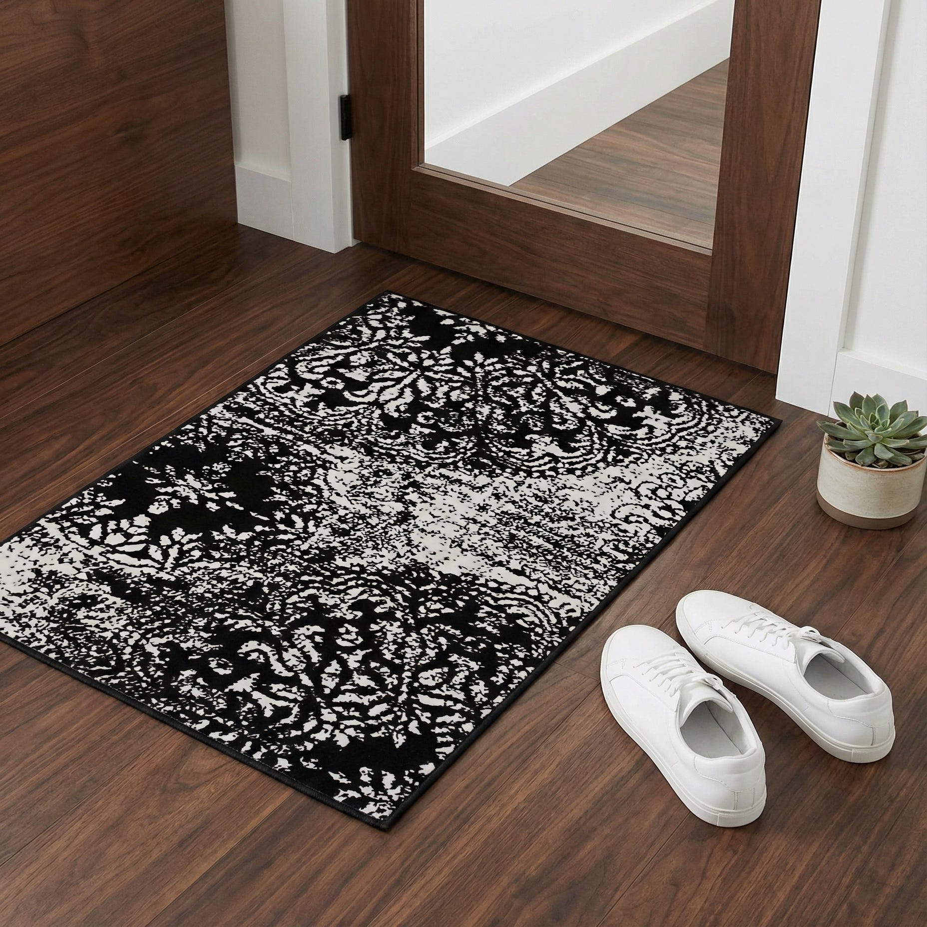 Primary color is Black. Colors in this rug include: Black, Ivory.