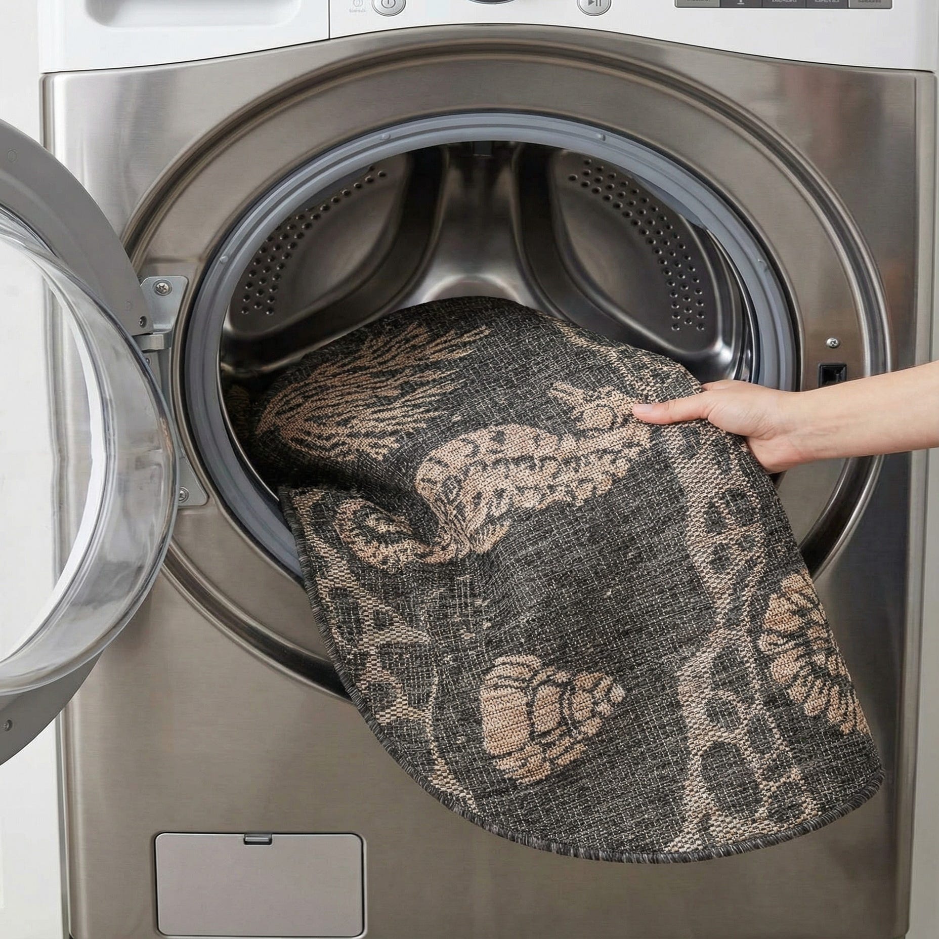 Primary color is Black. Colors in this rug include: Black, Light Brown.